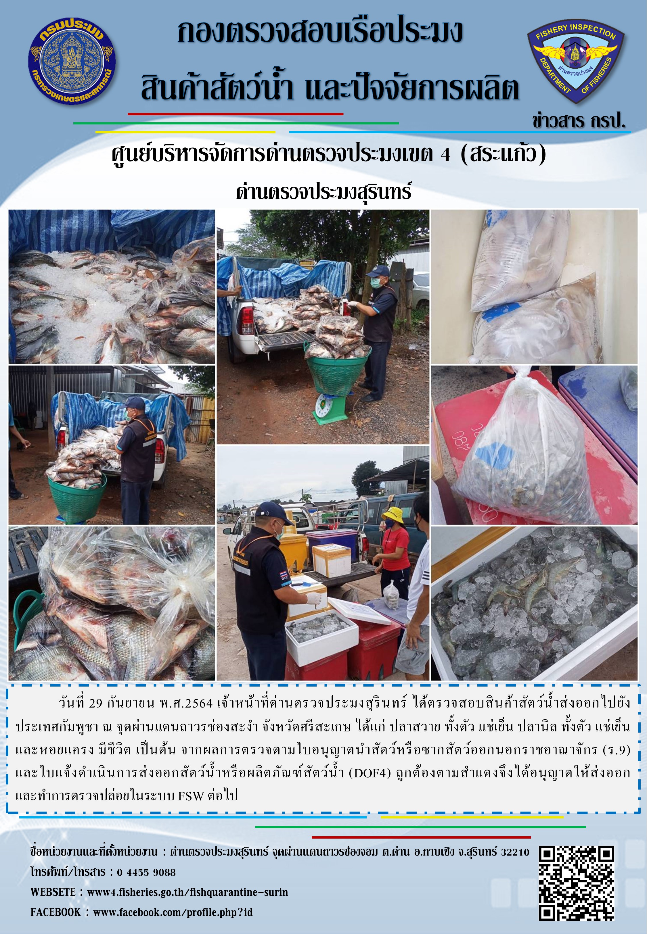 วันที่ 29 กันยายน พ.ศ.2564 เจ้าหน้าที่ด่านตรวจประมงสุรินทร์ ได้ตรวจสอบสินค้าสัตว์น้ำส่งออกไปยังประเทศกัมพูชา ณ จุดผ่านแดนถาวรช่องสะงำ จังหวัดศรีสะเกษ ได้แก่ ปลาสวาย ทั้งตัว แช่เย็น ปลานิล ทั้งตัว แช่เย็น และหอยแครง มีชีวิต เป็นต้น จากผลการตรวจตามใบอนุญาตนำสัตว์หรือซากสัตว์ออกนอกราชอาณาจักร (ร.9) และใบแจ้งดำเนินการส่งออกสัตว์น้ำหรือผลิตภัณฑ์สัตว์น้ำ (DOF4) ถูกต้องตามสำแดงจึงได้อนุญาตให้ส่งออก และทำการตรวจปล่อยในระบบ FSW ต่อไป
