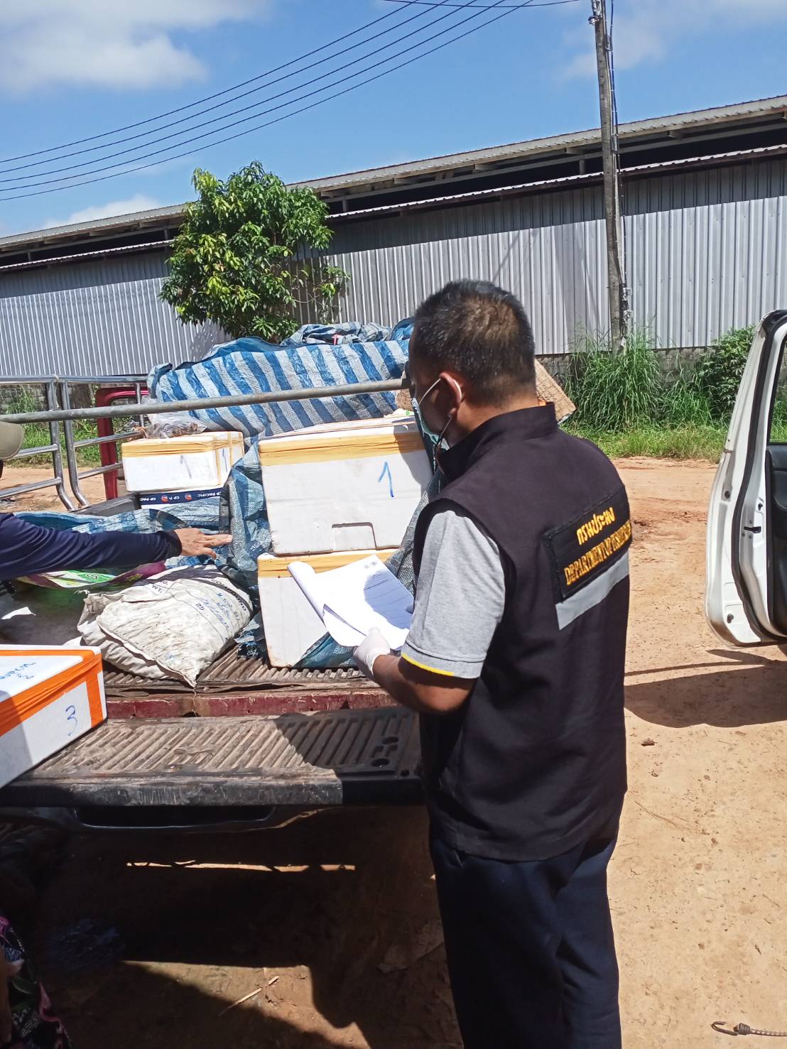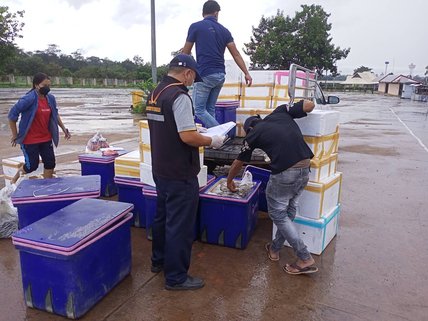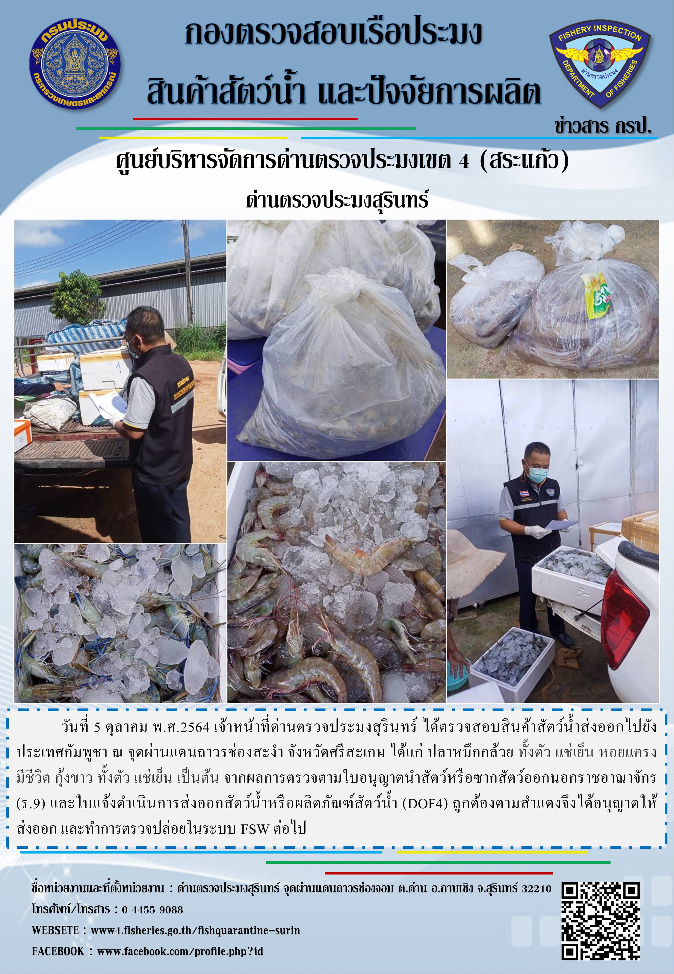 วันที่ 5 ตุลาคม พ.ศ.2564 เจ้าหน้าที่ด่านตรวจประมงสุรินทร์ ได้ตรวจสอบสินค้าสัตว์น้ำส่งออกไปยังประเทศกัมพูชา ณ จุดผ่านแดนถาวรช่องสะงำ จังหวัดศรีสะเกษ ได้แก่ ปลาหมึกกล้วย ทั้งตัว แช่เย็น หอยแครง มีชีวิต กุ้งขาว ทั้งตัว แช่เย็น เป็นต้น จากผลการตรวจตามใบอนุญาตนำสัตว์หรือซากสัตว์ออกนอกราชอาณาจักร (ร.9) และใบแจ้งดำเนินการส่งออกสัตว์น้ำหรือผลิตภัณฑ์สัตว์น้ำ (DOF4) ถูกต้องตามสำแดงจึงได้อนุญาตให้ส่งออก และทำการตรวจปล่อยในระบบ FSW ต่อไป