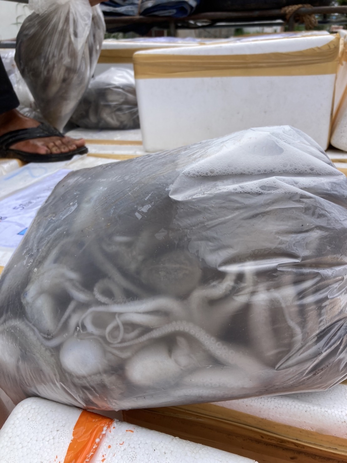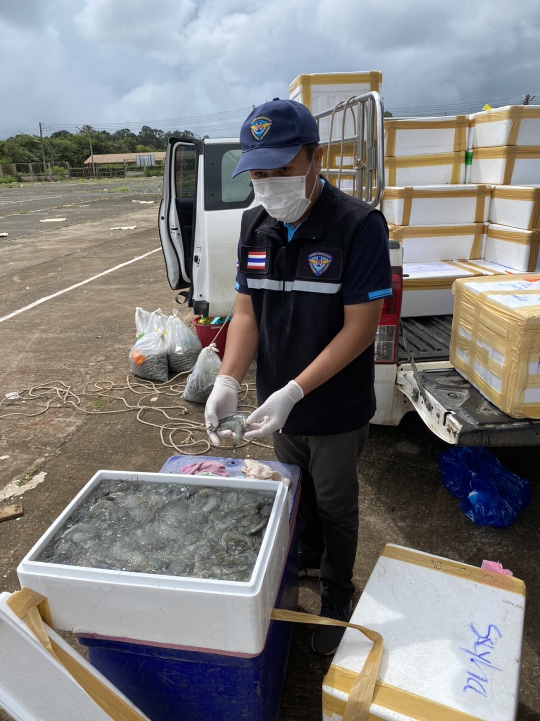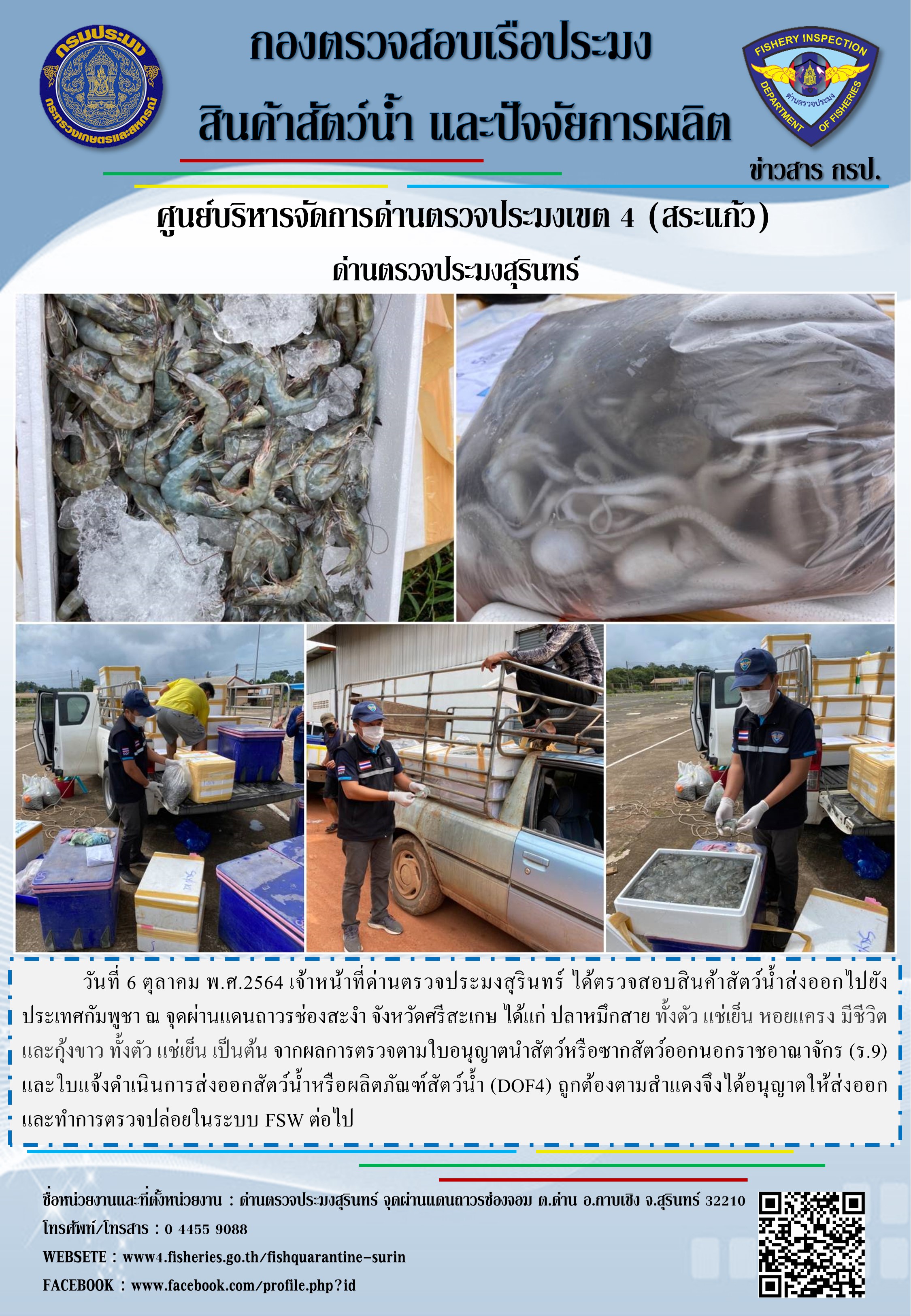 วันที่ 6 ตุลาคม พ.ศ.2564 เจ้าหน้าที่ด่านตรวจประมงสุรินทร์ ได้ตรวจสอบสินค้าสัตว์น้ำส่งออกไปยังประเทศกัมพูชา ณ จุดผ่านแดนถาวรช่องสะงำ จังหวัดศรีสะเกษ ได้แก่ ปลาหมึกสาย ทั้งตัว แช่เย็น หอยแครง มีชีวิต และกุ้งขาว ทั้งตัว แช่เย็น เป็นต้น จากผลการตรวจตามใบอนุญาตนำสัตว์หรือซากสัตว์ออกนอกราชอาณาจักร (ร.9) และใบแจ้งดำเนินการส่งออกสัตว์น้ำหรือผลิตภัณฑ์สัตว์น้ำ (DOF4) ถูกต้องตามสำแดงจึงได้อนุญาตให้ส่งออก และทำการตรวจปล่อยในระบบ FSW ต่อไป