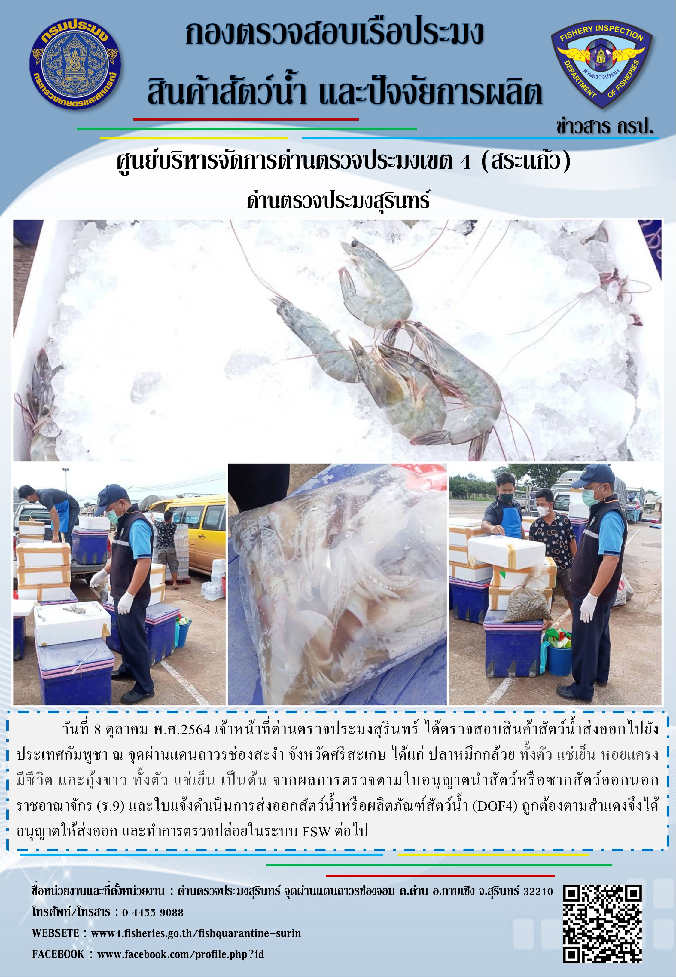 วันที่ 8 ตุลาคม พ.ศ.2564 เจ้าหน้าที่ด่านตรวจประมงสุรินทร์ ได้ตรวจสอบสินค้าสัตว์น้ำส่งออกไปยังประเทศกัมพูชา ณ จุดผ่านแดนถาวรช่องสะงำ จังหวัดศรีสะเกษ ได้แก่ ปลาหมึกกล้วย ทั้งตัว แช่เย็น หอยแครง มีชีวิต และกุ้งขาว ทั้งตัว แช่เย็น เป็นต้น จากผลการตรวจตามใบอนุญาตนำสัตว์หรือซากสัตว์ออกนอกราชอาณาจักร (ร.9) และใบแจ้งดำเนินการส่งออกสัตว์น้ำหรือผลิตภัณฑ์สัตว์น้ำ (DOF4) ถูกต้องตามสำแดงจึงได้อนุญาตให้ส่งออก และทำการตรวจปล่อยในระบบ FSW ต่อไป