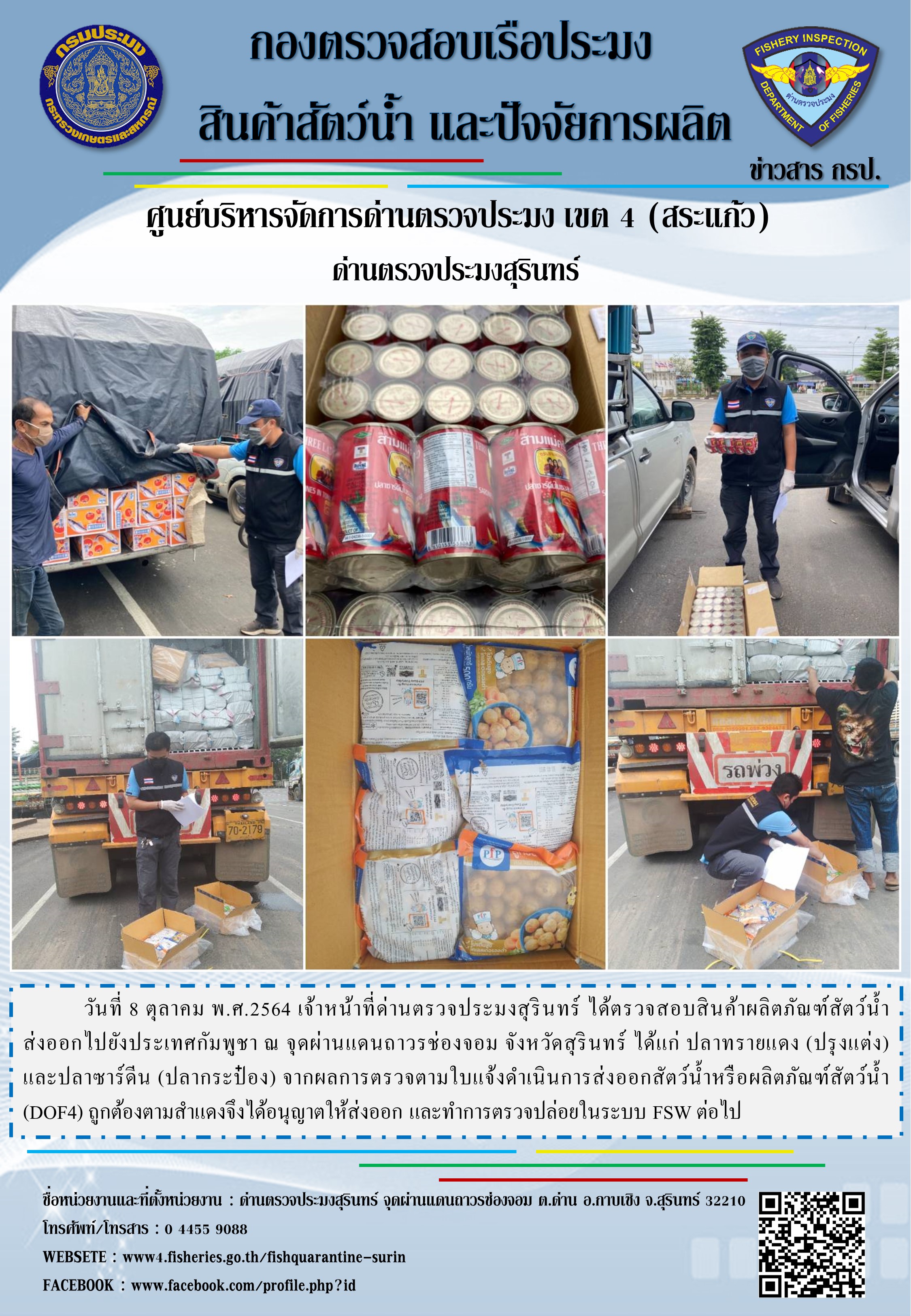 วันที่ 8 ตุลาคม พ.ศ.2564 เจ้าหน้าที่ด่านตรวจประมงสุรินทร์ ได้ตรวจสอบสินค้าผลิตภัณฑ์สัตว์น้ำส่งออกไปยังประเทศกัมพูชา ณ จุดผ่านแดนถาวรช่องจอม จังหวัดสุรินทร์ ได้แก่ ปลาทรายแดง (ปรุงแต่ง) และปลาซาร์ดีน (ปลากระป๋อง) จากผลการตรวจตามใบแจ้งดำเนินการส่งออกสัตว์น้ำหรือผลิตภัณฑ์สัตว์น้ำ (DOF4) ถูกต้องตามสำแดงจึงได้อนุญาตให้ส่งออก และทำการตรวจปล่อยในระบบ FSW ต่อไป