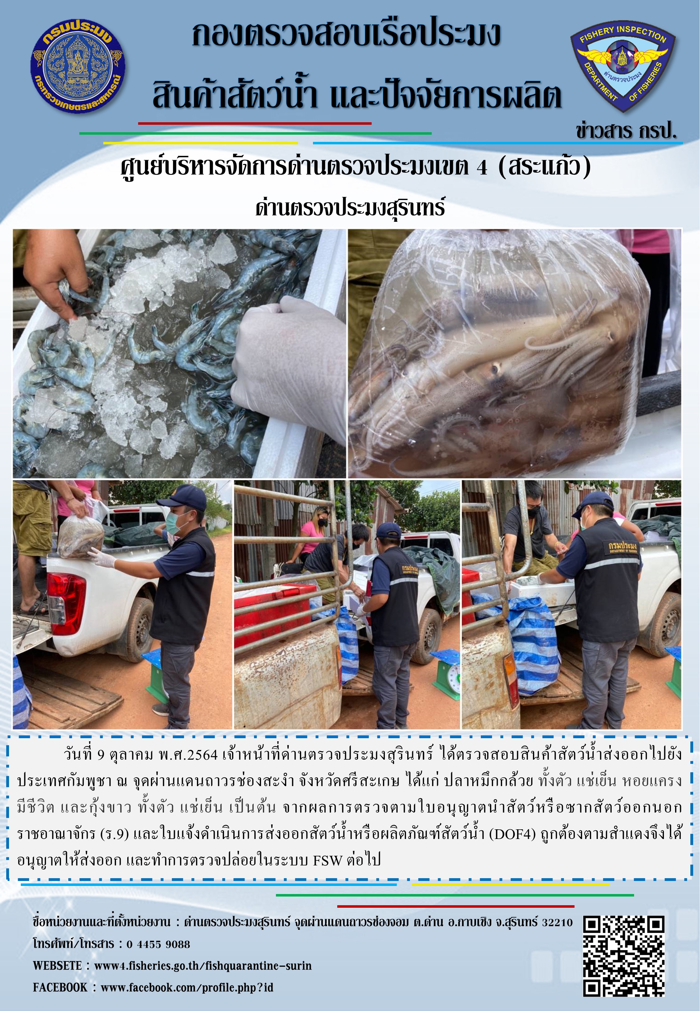 วันที่ 9 ตุลาคม พ.ศ.2564 เจ้าหน้าที่ด่านตรวจประมงสุรินทร์ ได้ตรวจสอบสินค้าสัตว์น้ำส่งออกไปยังประเทศกัมพูชา ณ จุดผ่านแดนถาวรช่องสะงำ จังหวัดศรีสะเกษ ได้แก่ ปลาหมึกกล้วย ทั้งตัว แช่เย็น หอยแครง มีชีวิต และกุ้งขาว ทั้งตัว แช่เย็น เป็นต้น จากผลการตรวจตามใบอนุญาตนำสัตว์หรือซากสัตว์ออกนอกราชอาณาจักร (ร.9) และใบแจ้งดำเนินการส่งออกสัตว์น้ำหรือผลิตภัณฑ์สัตว์น้ำ (DOF4) ถูกต้องตามสำแดงจึงได้อนุญาตให้ส่งออก และทำการตรวจปล่อยในระบบ FSW ต่อไป