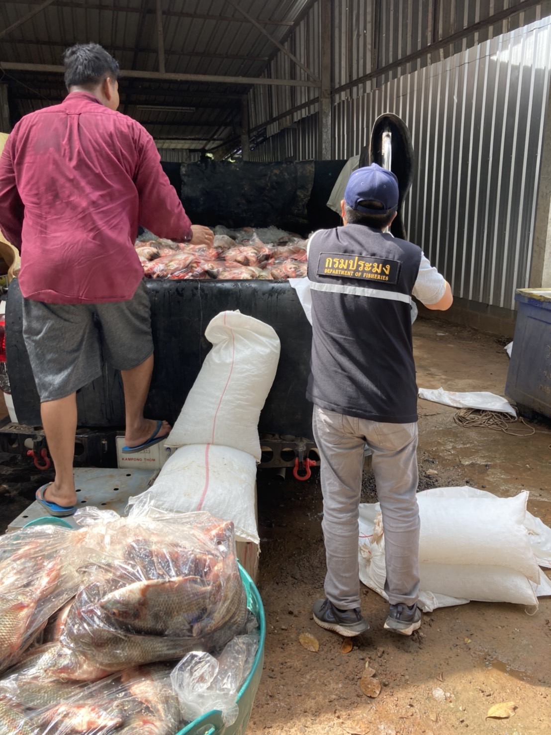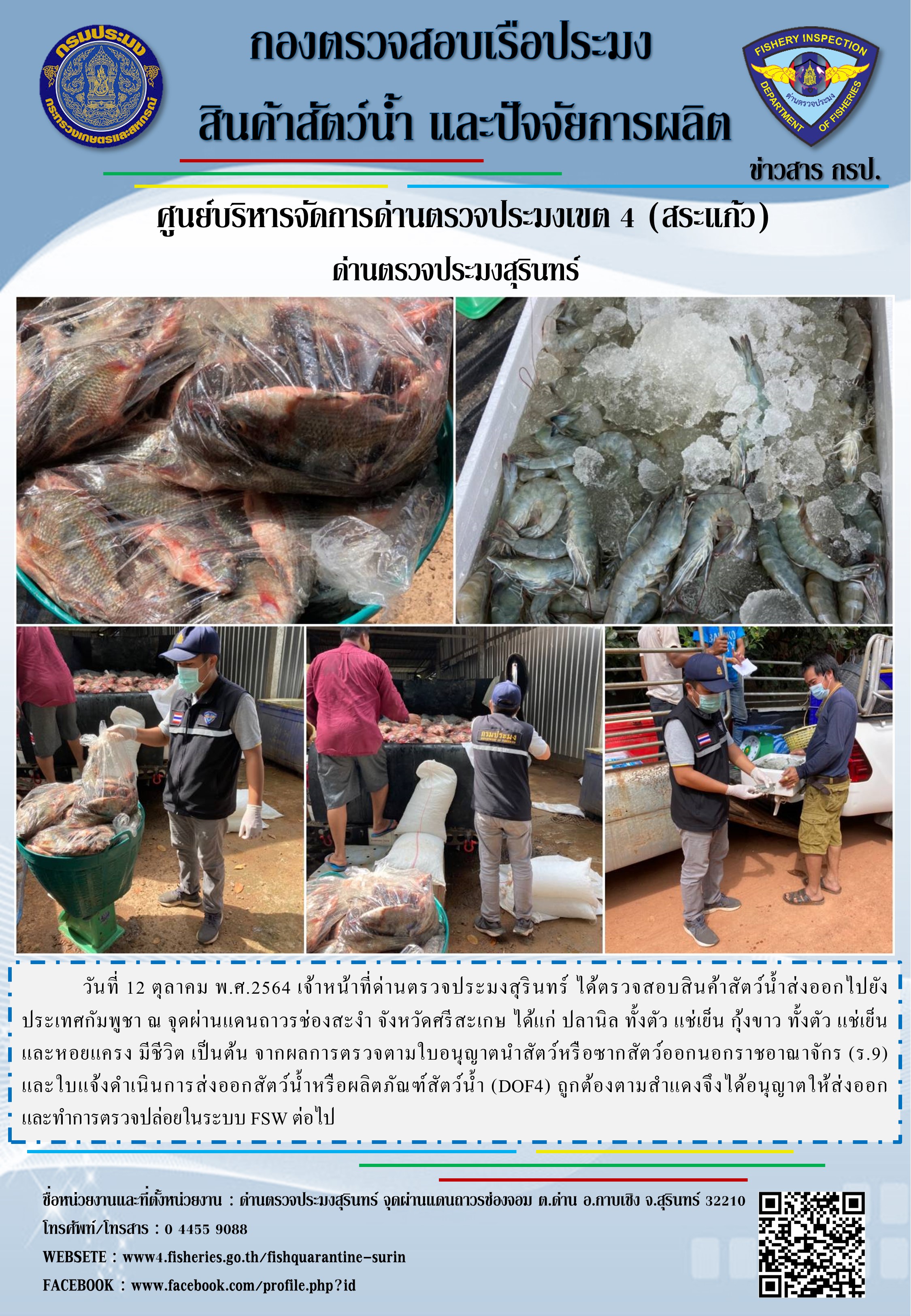 วันที่ 12 ตุลาคม พ.ศ.2564 เจ้าหน้าที่ด่านตรวจประมงสุรินทร์ ได้ตรวจสอบสินค้าสัตว์น้ำส่งออกไปยังประเทศกัมพูชา ณ จุดผ่านแดนถาวรช่องสะงำ จังหวัดศรีสะเกษ ได้แก่ ปลานิล ทั้งตัว แช่เย็น กุ้งขาว ทั้งตัว แช่เย็น และหอยแครง มีชีวิต เป็นต้น จากผลการตรวจตามใบอนุญาตนำสัตว์หรือซากสัตว์ออกนอกราชอาณาจักร (ร.9) และใบแจ้งดำเนินการส่งออกสัตว์น้ำหรือผลิตภัณฑ์สัตว์น้ำ (DOF4) ถูกต้องตามสำแดงจึงได้อนุญาตให้ส่งออก และทำการตรวจปล่อยในระบบ FSW ต่อไป