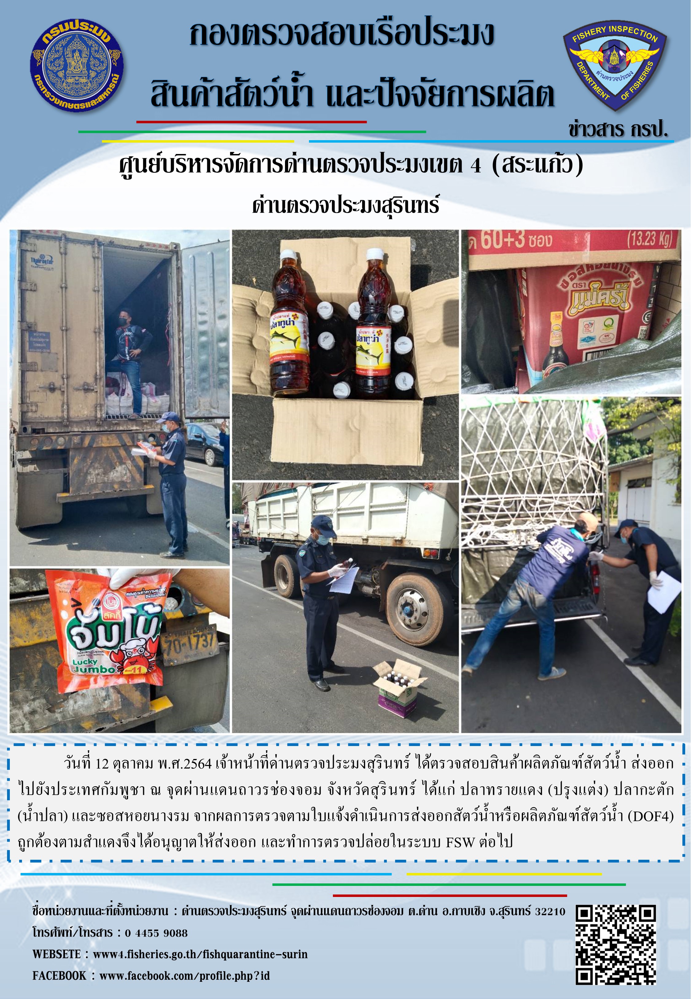 วันที่ 12 ตุลาคม พ.ศ.2564 เจ้าหน้าที่ด่านตรวจประมงสุรินทร์ ได้ตรวจสอบสินค้าผลิตภัณฑ์สัตว์น้ำ ส่งออกไปยังประเทศกัมพูชา ณ จุดผ่านแดนถาวรช่องจอม จังหวัดสุรินทร์ ได้แก่ ปลาทรายแดง (ปรุงแต่ง) ปลากะตัก (น้ำปลา) และซอสหอยนางรม จากผลการตรวจตามใบแจ้งดำเนินการส่งออกสัตว์น้ำหรือผลิตภัณฑ์สัตว์น้ำ (DOF4) ถูกต้องตามสำแดงจึงได้อนุญาตให้ส่งออก และทำการตรวจปล่อยในระบบ FSW ต่อไป