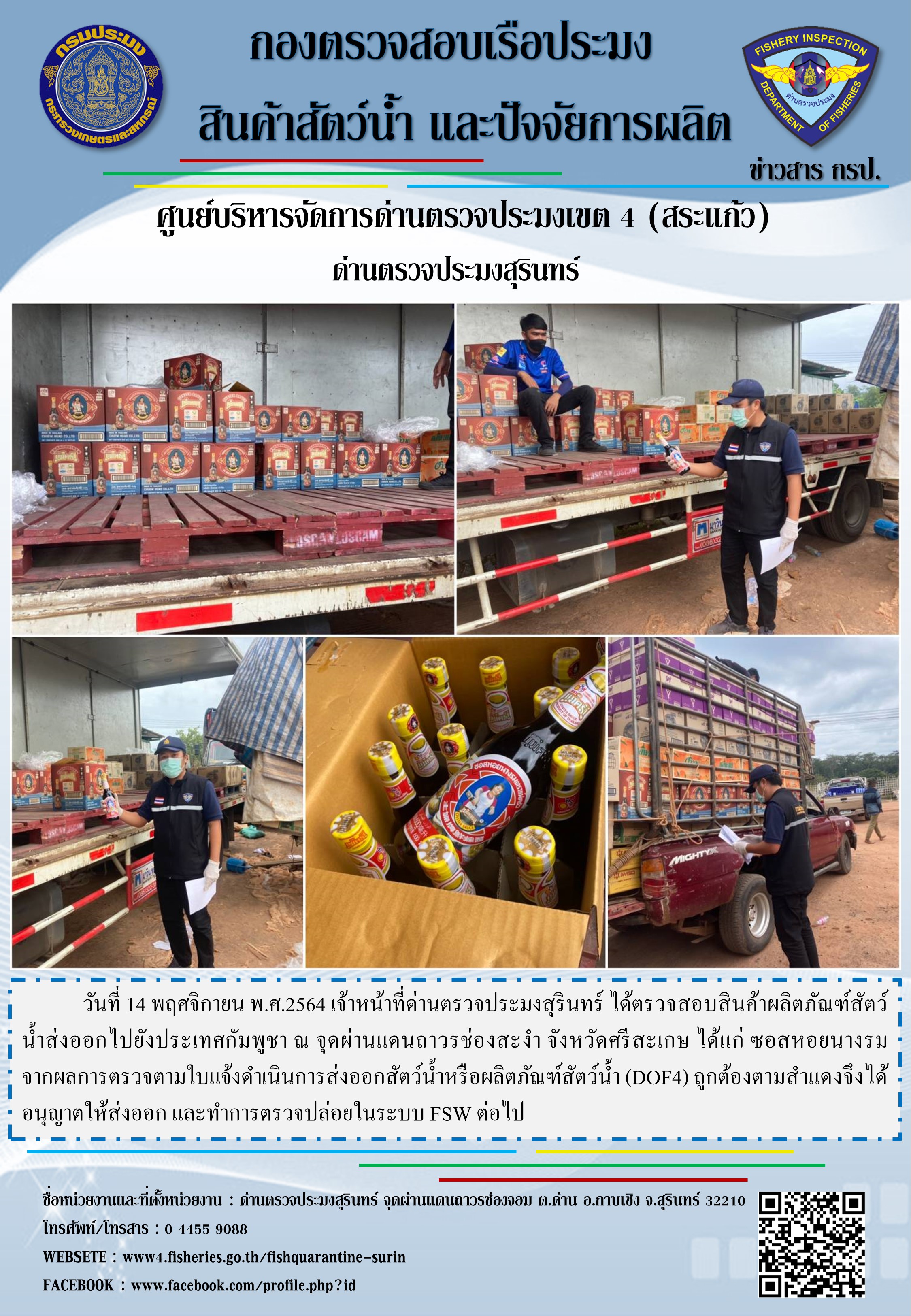 วันที่ 14 พฤศจิกายน พ.ศ.2564 เจ้าหน้าที่ด่านตรวจประมงสุรินทร์ ได้ตรวจสอบสินค้าผลิตภัณฑ์สัตว์น้ำส่งออกไปยังประเทศกัมพูชา ณ จุดผ่านแดนถาวรช่องสะงำ จังหวัดศรีสะเกษ ได้แก่ ซอสหอยนางรม จากผลการตรวจตามใบแจ้งดำเนินการส่งออกสัตว์น้ำหรือผลิตภัณฑ์สัตว์น้ำ (DOF4) ถูกต้องตามสำแดงจึงได้อนุญาตให้ส่งออก และทำการตรวจปล่อยในระบบ FSW ต่อไป