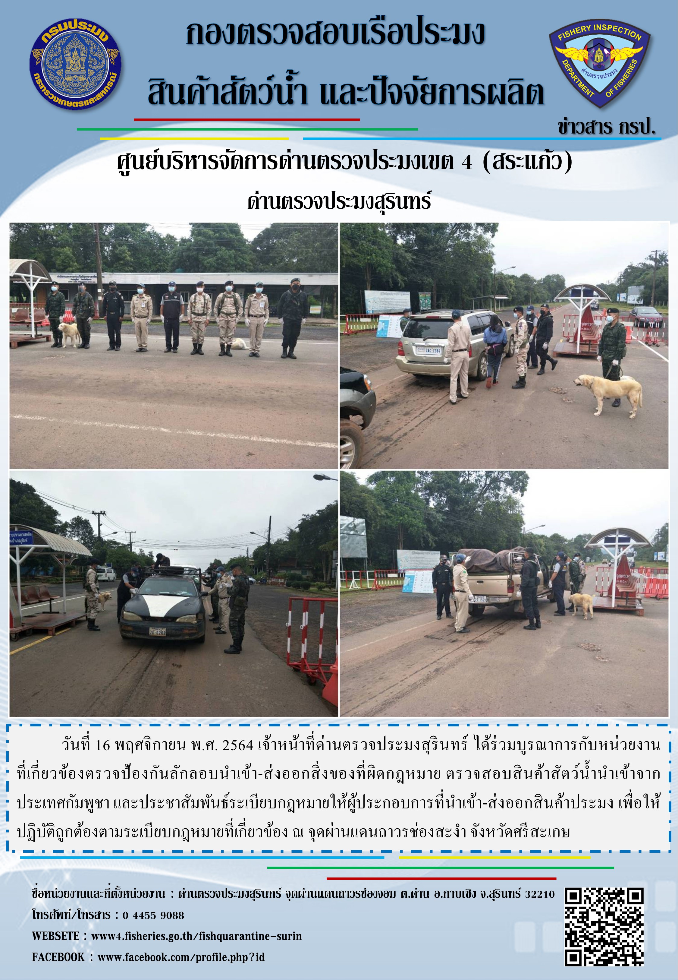 วันที่ 16 พฤศจิกายน พ.ศ. 2564 เจ้าหน้าที่ด่านตรวจประมงสุรินทร์ ได้ร่วมบูรณาการกับหน่วยงานที่เกี่ยวข้องตรวจป้องกันลักลอบนำเข้า-ส่งออกสิ่งของที่ผิดกฎหมาย ตรวจสอบสินค้าสัตว์น้ำนำเข้าจากประเทศกัมพูชา และประชาสัมพันธ์ระเบียบกฎหมายให้ผู้ประกอบการที่นำเข้า-ส่งออกสินค้าประมง เพื่อให้ปฏิบัติถูกต้องตามระเบียบกฎหมายที่เกี่ยวข้อง ณ จุดผ่านแดนถาวรช่องสะงำ จังหวัดศรีสะเกษ