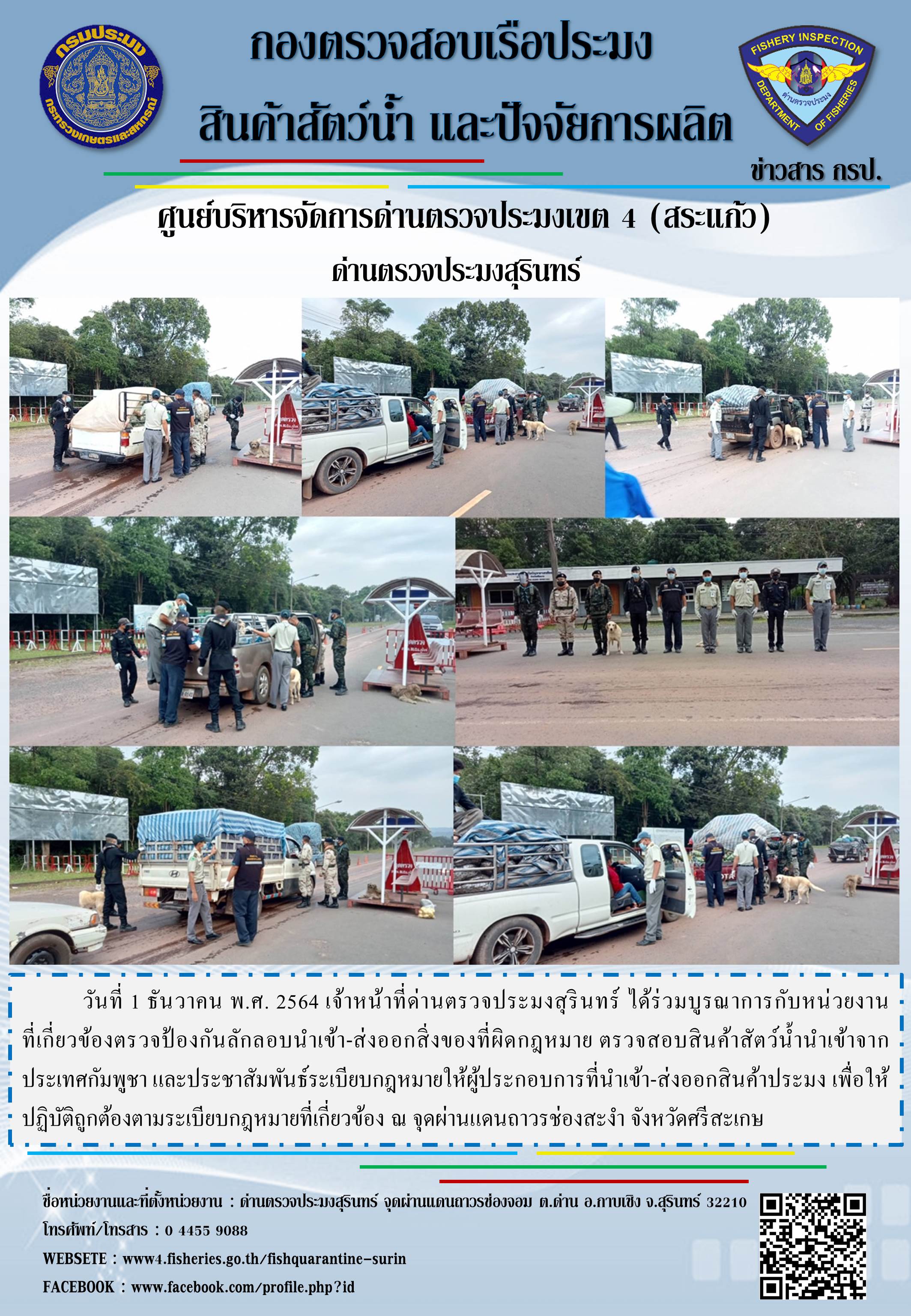 วันที่ 1 ธันวาคน พ.ศ. 2564 เจ้าหน้าที่ด่านตรวจประมงสุรินทร์ ได้ร่วมบูรณาการกับหน่วยงานที่เกี่ยวข้องตรวจป้องกันลักลอบนำเข้า-ส่งออกสิ่งของที่ผิดกฎหมาย ตรวจสอบสินค้าสัตว์น้ำนำเข้าจาก ประเทศกัมพูชา และประชาสัมพันธ์ระเบียบกฎหมายให้ผู้ประกอบการที่นำเข้า-ส่งออกสินค้าประมง เพื่อให้ปฏิบัติถูกต้องตามระเบียบกฎหมายที่เกี่ยวข้อง ณ จุดผ่านแดนถาวรช่องสะงำ จังหวัดศรีสะเกษ