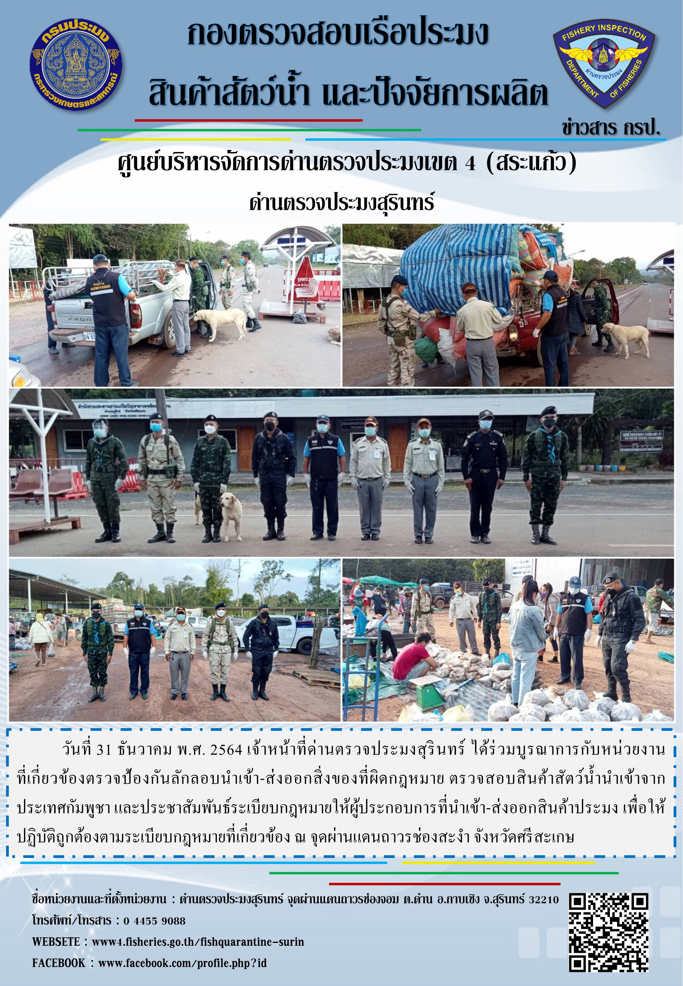 วันที่ 31 ธันวาคม พ.ศ. 2564 เจ้าหน้าที่ด่านตรวจประมงสุรินทร์ ได้ร่วมบูรณาการกับหน่วยงานที่เกี่ยวข้องตรวจป้องกันลักลอบนำเข้า-ส่งออกสิ่งของที่ผิดกฎหมาย ตรวจสอบสินค้าสัตว์น้ำนำเข้าจากประเทศกัมพูชา และประชาสัมพันธ์ระเบียบกฎหมายให้ผู้ประกอบการที่นำเข้า-ส่งออกสินค้าประมง เพื่อให้ปฏิบัติถูกต้องตามระเบียบกฎหมายที่เกี่ยวข้อง ณ จุดผ่านแดนถาวรช่องสะงำ จังหวัดศรีสะเกษ