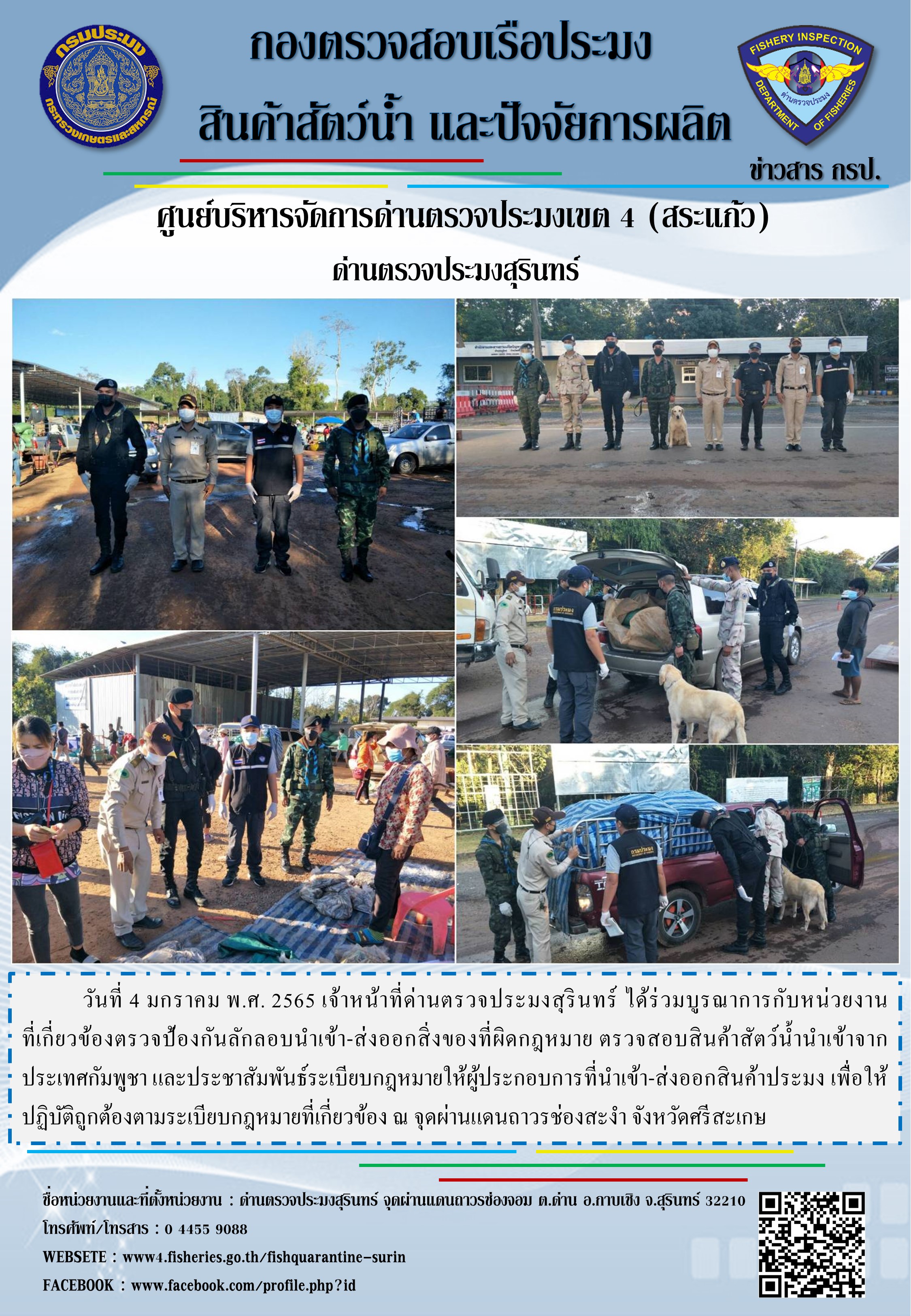 วันที่ 4 มกราคม พ.ศ. 2565 เจ้าหน้าที่ด่านตรวจประมงสุรินทร์ ได้ร่วมบูรณาการกับหน่วยงานที่เกี่ยวข้องตรวจป้องกันลักลอบนำเข้า-ส่งออกสิ่งของที่ผิดกฎหมาย ตรวจสอบสินค้าสัตว์น้ำนำเข้าจากประเทศกัมพูชา และประชาสัมพันธ์ระเบียบกฎหมายให้ผู้ประกอบการที่นำเข้า-ส่งออกสินค้าประมง เพื่อให้ปฏิบัติถูกต้องตามระเบียบกฎหมายที่เกี่ยวข้อง ณ จุดผ่านแดนถาวรช่องสะงำ จังหวัดศรีสะเกษ