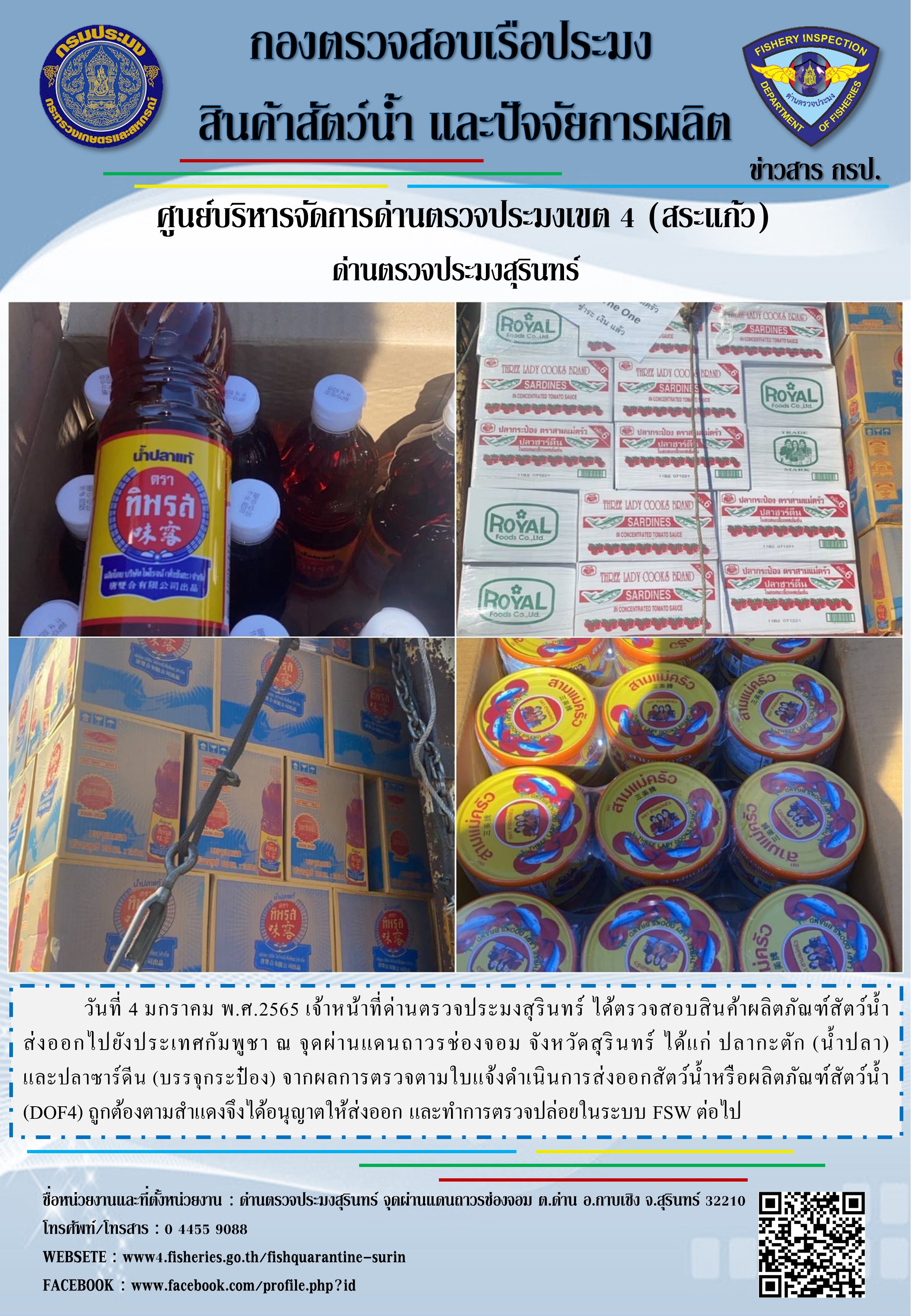 วันที่ 4 มกราคม พ.ศ.2565 เจ้าหน้าที่ด่านตรวจประมงสุรินทร์ ได้ตรวจสอบสินค้าผลิตภัณฑ์สัตว์น้ำส่งออกไปยังประเทศกัมพูชา ณ จุดผ่านแดนถาวรช่องจอม จังหวัดสุรินทร์ ได้แก่ ปลากะตัก (น้ำปลา) และปลาซาร์ดีน (บรรจุกระป๋อง) จากผลการตรวจตามใบแจ้งดำเนินการส่งออกสัตว์น้ำหรือผลิตภัณฑ์สัตว์น้ำ (DOF4) ถูกต้องตามสำแดงจึงได้อนุญาตให้ส่งออก และทำการตรวจปล่อยในระบบ FSW ต่อไป