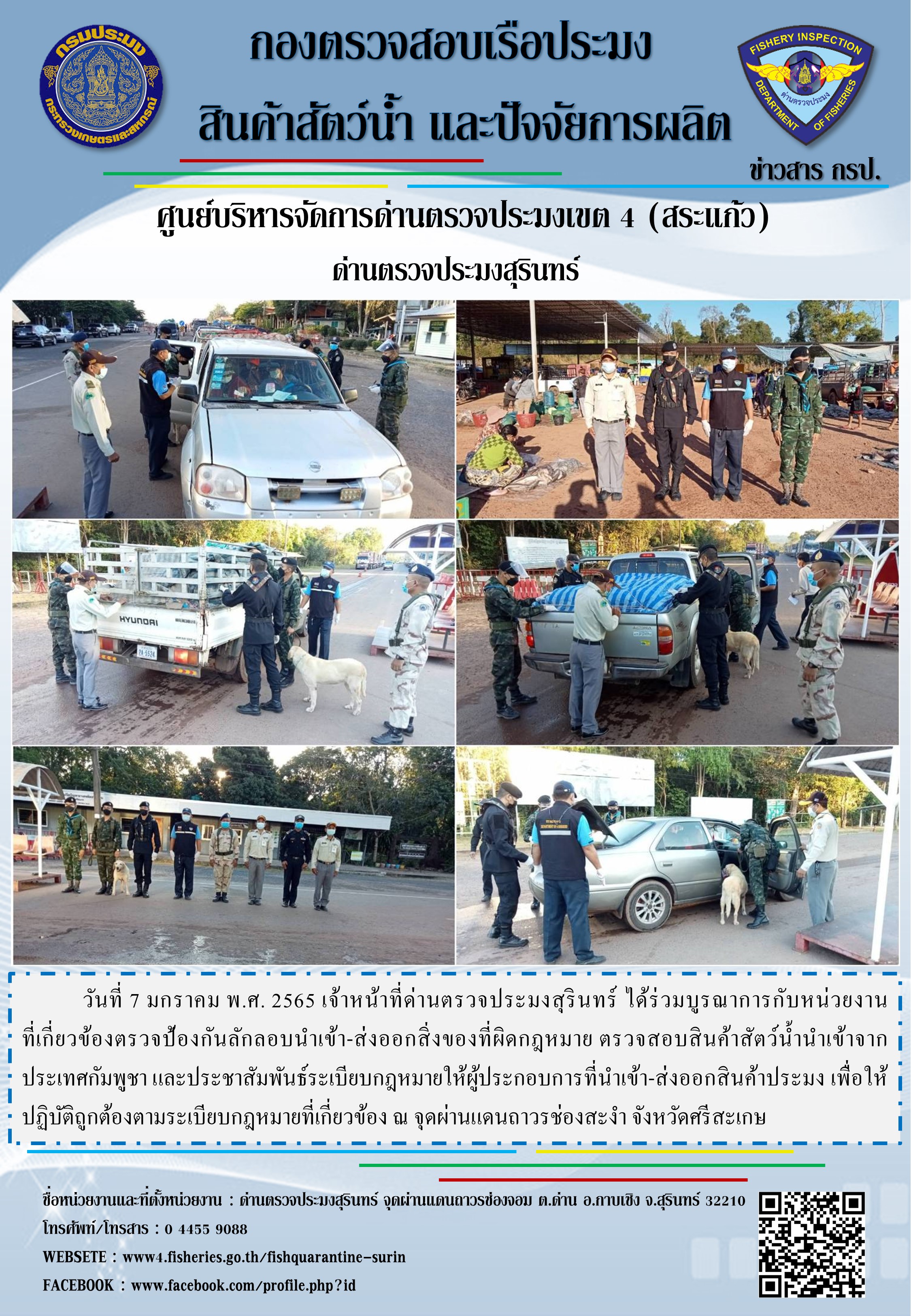 วันที่ 7 มกราคม พ.ศ. 2565 เจ้าหน้าที่ด่านตรวจประมงสุรินทร์ ได้ร่วมบูรณาการกับหน่วยงานที่เกี่ยวข้องตรวจป้องกันลักลอบนำเข้า-ส่งออกสิ่งของที่ผิดกฎหมาย ตรวจสอบสินค้าสัตว์น้ำนำเข้าจากประเทศกัมพูชา และประชาสัมพันธ์ระเบียบกฎหมายให้ผู้ประกอบการที่นำเข้า-ส่งออกสินค้าประมง เพื่อให้ปฏิบัติถูกต้องตามระเบียบกฎหมายที่เกี่ยวข้อง ณ จุดผ่านแดนถาวรช่องสะงำ จังหวัดศรีสะเกษ