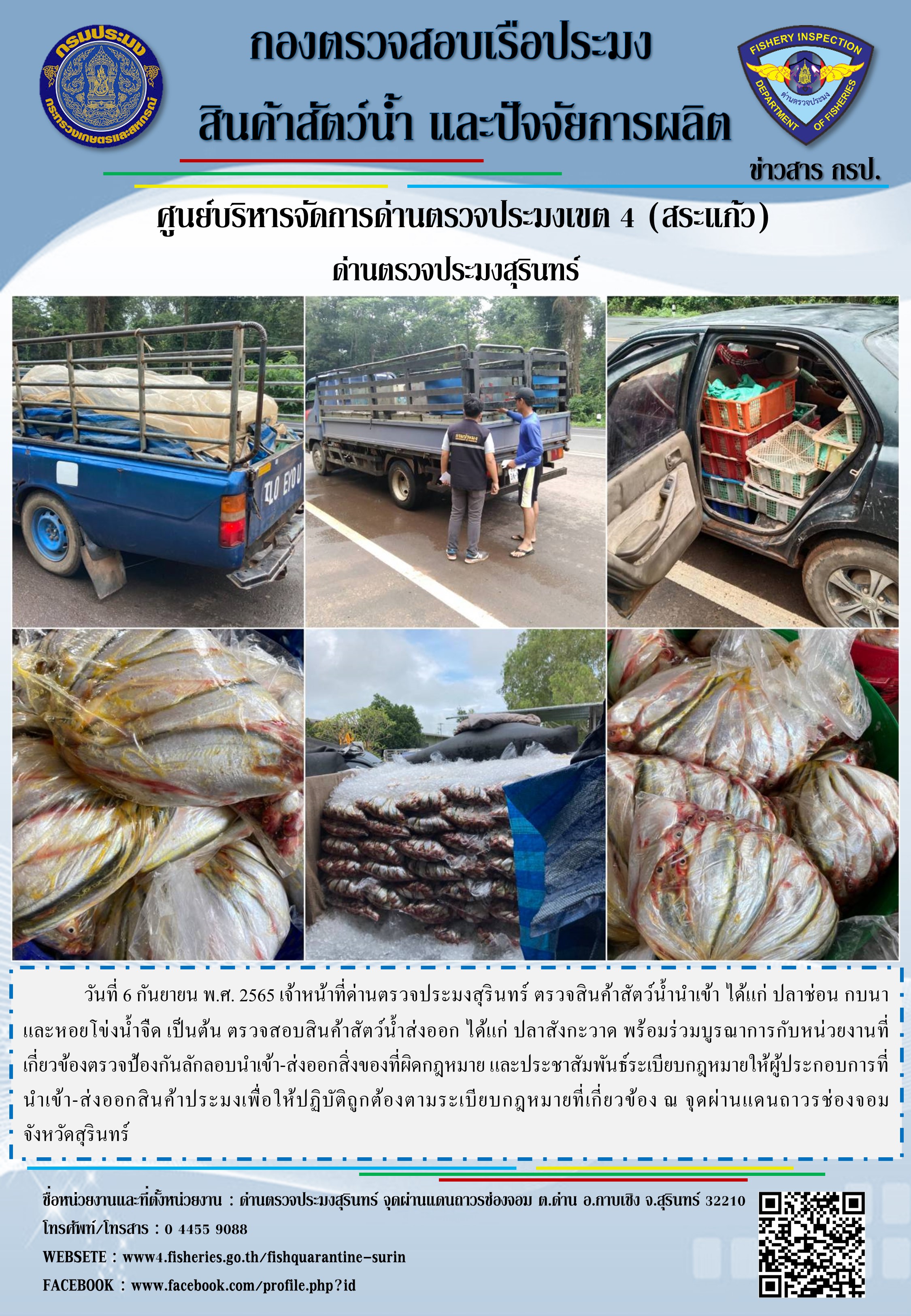 ผลการปฏิบัติงานด่านตรวจประมงสุรินทร์ วันที่ 6 กันยายน พ.ศ.2565 ณ จุดผ่านแดนถาวรช่องจอม