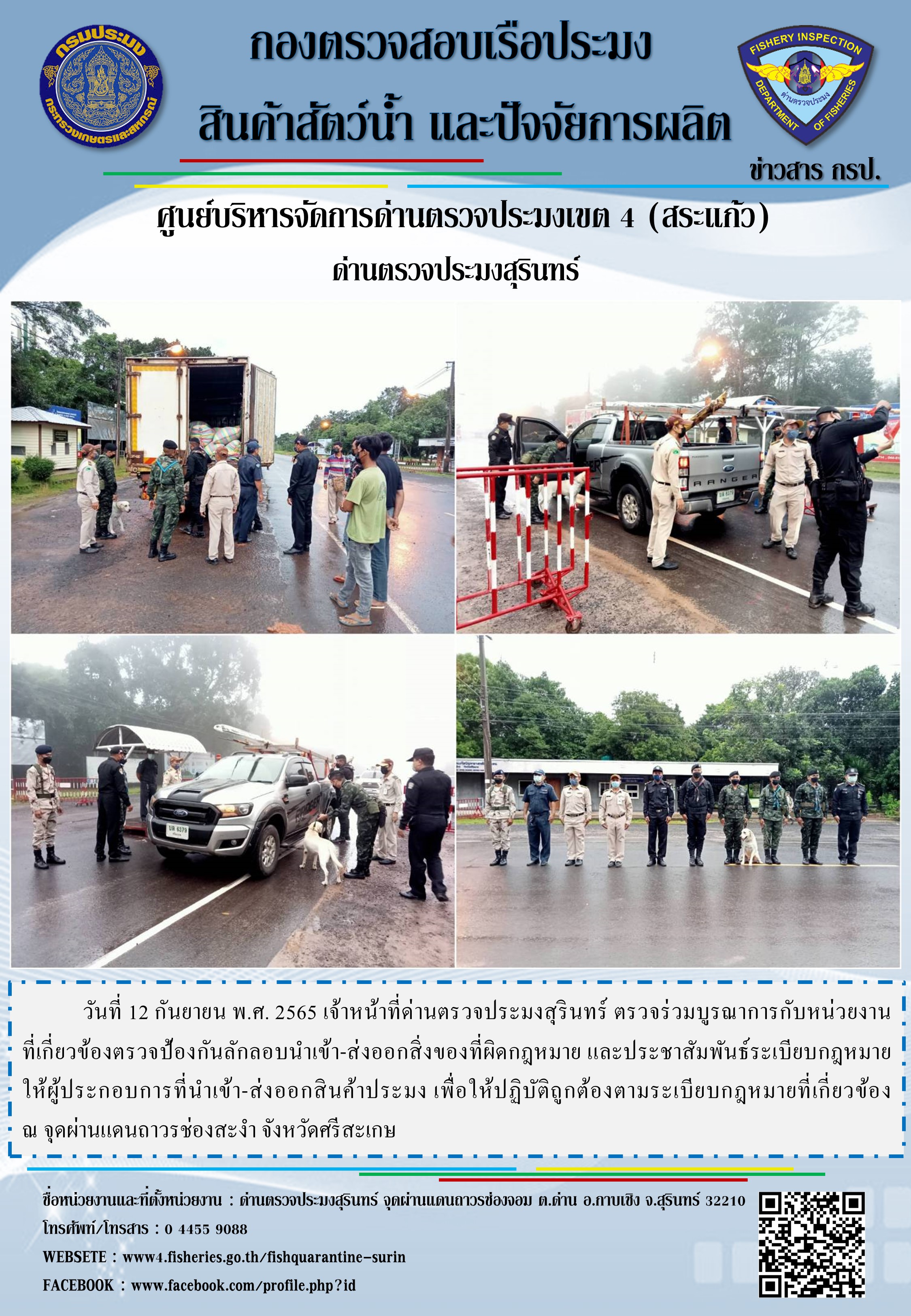ผลการปฏิบัติงานด่านตรวจประมงสุรินทร์ วันที่ 12 กันยายน พ.ศ.2565 ณ จุดผ่านแดนถาวรช่องสะงำ