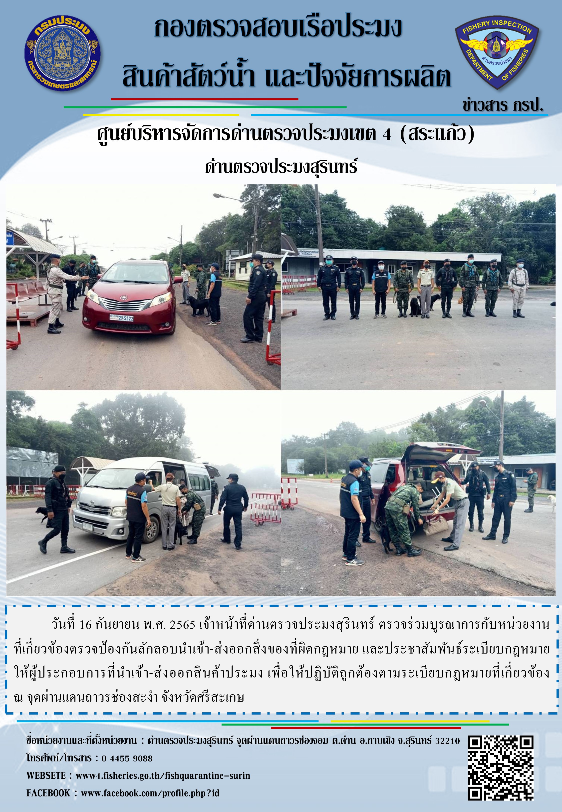ผลการปฏิบัติงานด่านตรวจประมงสุรินทร์ วันที่ 16 กันยายน พ.ศ.2565 ณ จุดผ่านแดนถาวรช่องสะงำ