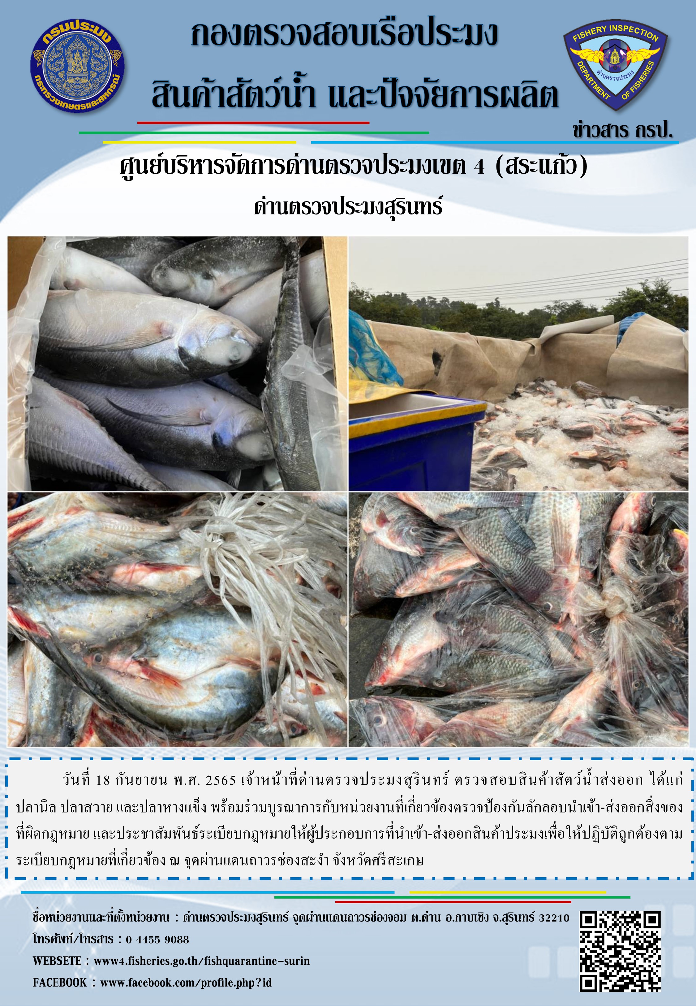 วันที่ 18 กันยายน พ.ศ. 2565 เจ้าหน้าที่ด่านตรวจประมงสุรินทร์ ตรวจสอบสินค้าสัตว์น้ำส่งออก ได้แก่ ปลานิล ปลาสวาย และปลาหางแข็ง พร้อมร่วมบูรณาการกับหน่วยงานที่เกี่ยวข้องตรวจป้องกันลักลอบนำเข้า-ส่งออกสิ่งของที่ผิดกฎหมาย และประชาสัมพันธ์ระเบียบกฎหมายให้ผู้ประกอบการที่นำเข้า-ส่งออกสินค้าประมงเพื่อให้ปฏิบัติถูกต้องตามระเบียบกฎหมายที่เกี่ยวข้อง ณ จุดผ่านแดนถาวรช่องสะงำ จังหวัดศรีสะเกษ