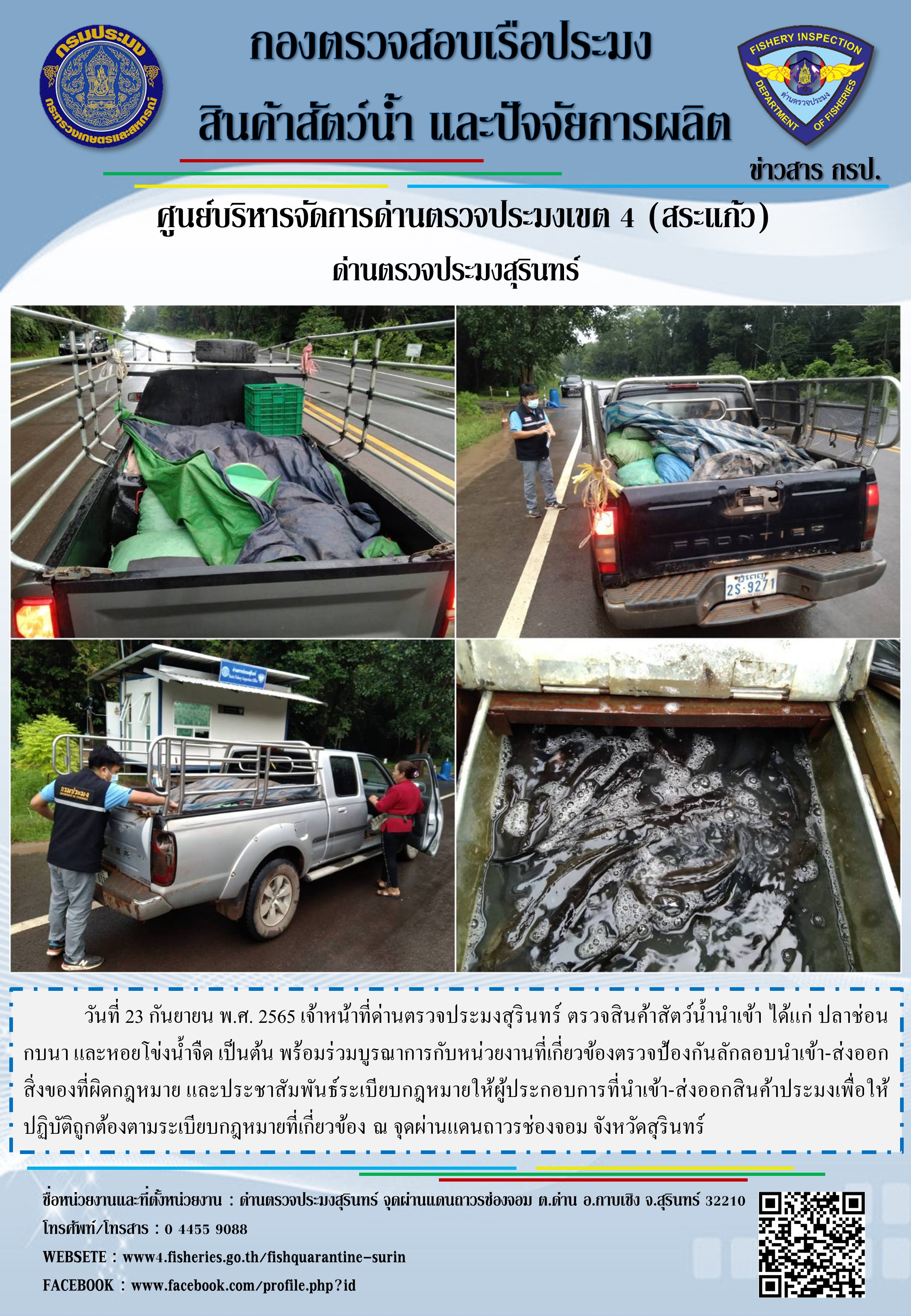 วันที่ 23 กันยายน พ.ศ. 2565 เจ้าหน้าที่ด่านตรวจประมงสุรินทร์ ตรวจสินค้าสัตว์น้ำนำเข้า ได้แก่ ปลาช่อน กบนา และหอยโข่งน้ำจืด เป็นต้น พร้อมร่วมบูรณาการกับหน่วยงานที่เกี่ยวข้องตรวจป้องกันลักลอบนำเข้า-ส่งออกสิ่งของที่ผิดกฎหมาย และประชาสัมพันธ์ระเบียบกฎหมายให้ผู้ประกอบการที่นำเข้า-ส่งออกสินค้าประมงเพื่อให้ปฏิบัติถูกต้องตามระเบียบกฎหมายที่เกี่ยวข้อง ณ จุดผ่านแดนถาวรช่องจอม จังหวัดสุรินทร์
