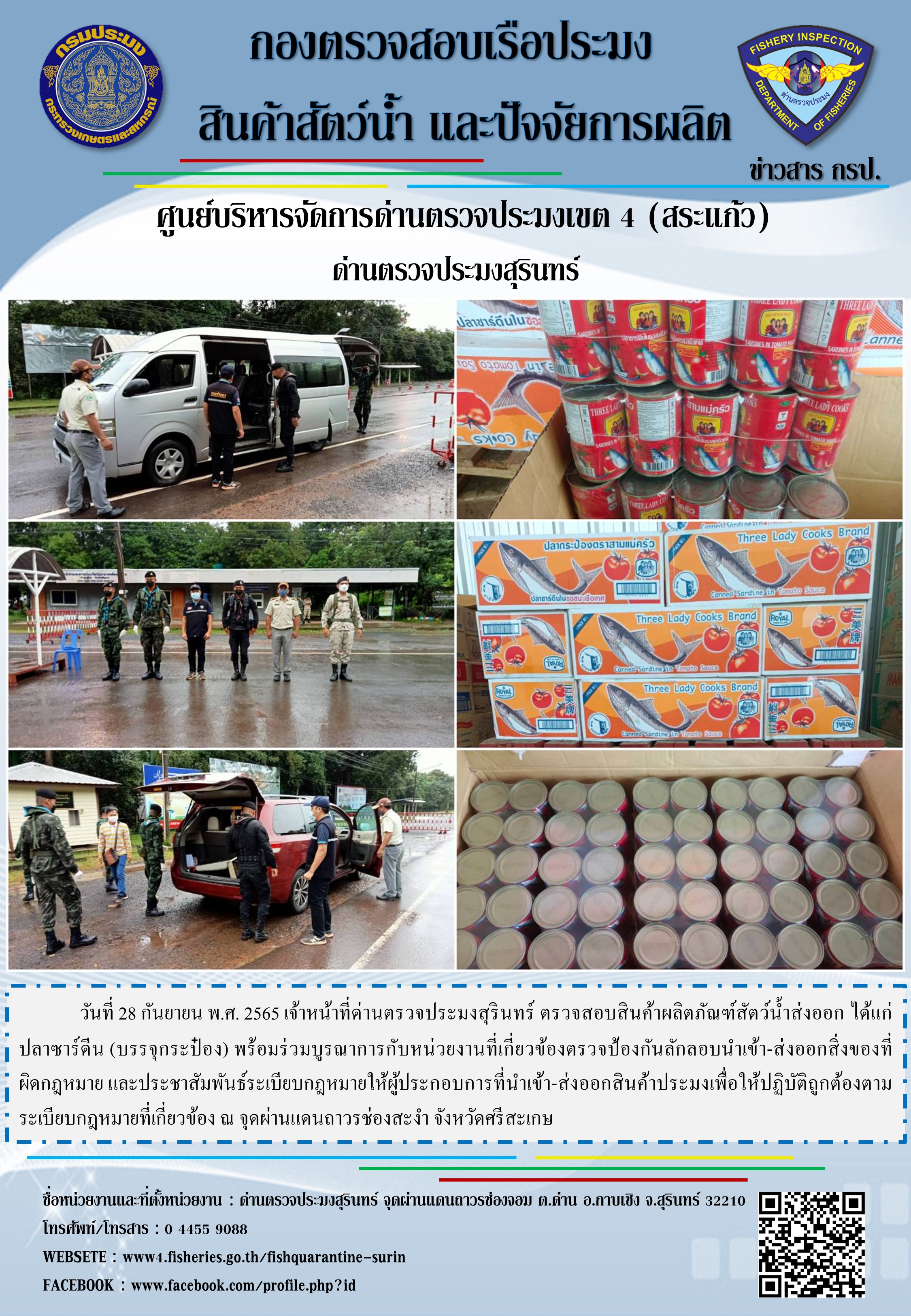 วันที่ 28 กันยายน พ.ศ. 2565 เจ้าหน้าที่ด่านตรวจประมงสุรินทร์ ตรวจสอบสินค้าผลิตภัณฑ์สัตว์น้ำส่งออก ได้แก่ ปลาซาร์ดีน (บรรจุกระป๋อง) พร้อมร่วมบูรณาการกับหน่วยงานที่เกี่ยวข้องตรวจป้องกันลักลอบนำเข้า-ส่งออกสิ่งของที่ผิดกฎหมาย และประชาสัมพันธ์ระเบียบกฎหมายให้ผู้ประกอบการที่นำเข้า-ส่งออกสินค้าประมงเพื่อให้ปฏิบัติถูกต้องตามระเบียบกฎหมายที่เกี่ยวข้อง ณ จุดผ่านแดนถาวรช่องสะงำ จังหวัดศรีสะเกษ