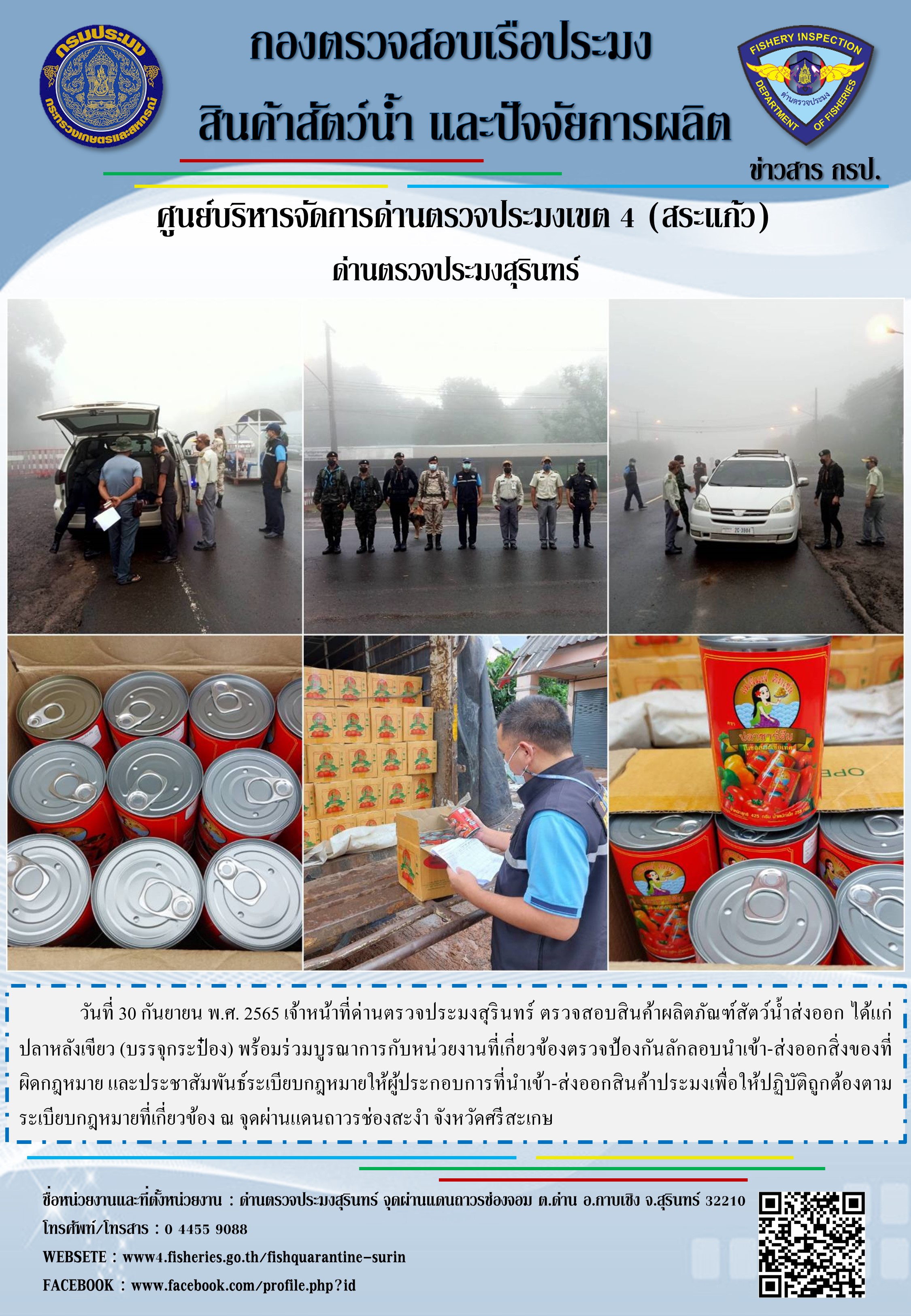วันที่ 30 กันยายน พ.ศ. 2565 เจ้าหน้าที่ด่านตรวจประมงสุรินทร์ ตรวจสอบสินค้าผลิตภัณฑ์สัตว์น้ำส่งออก ได้แก่ ปลาหลังเขียว (บรรจุกระป๋อง) พร้อมร่วมบูรณาการกับหน่วยงานที่เกี่ยวข้องตรวจป้องกันลักลอบนำเข้า-ส่งออกสิ่งของที่ผิดกฎหมาย และประชาสัมพันธ์ระเบียบกฎหมายให้ผู้ประกอบการที่นำเข้า-ส่งออกสินค้าประมงเพื่อให้ปฏิบัติถูกต้องตามระเบียบกฎหมายที่เกี่ยวข้อง ณ จุดผ่านแดนถาวรช่องสะงำ จังหวัดศรีสะเกษ