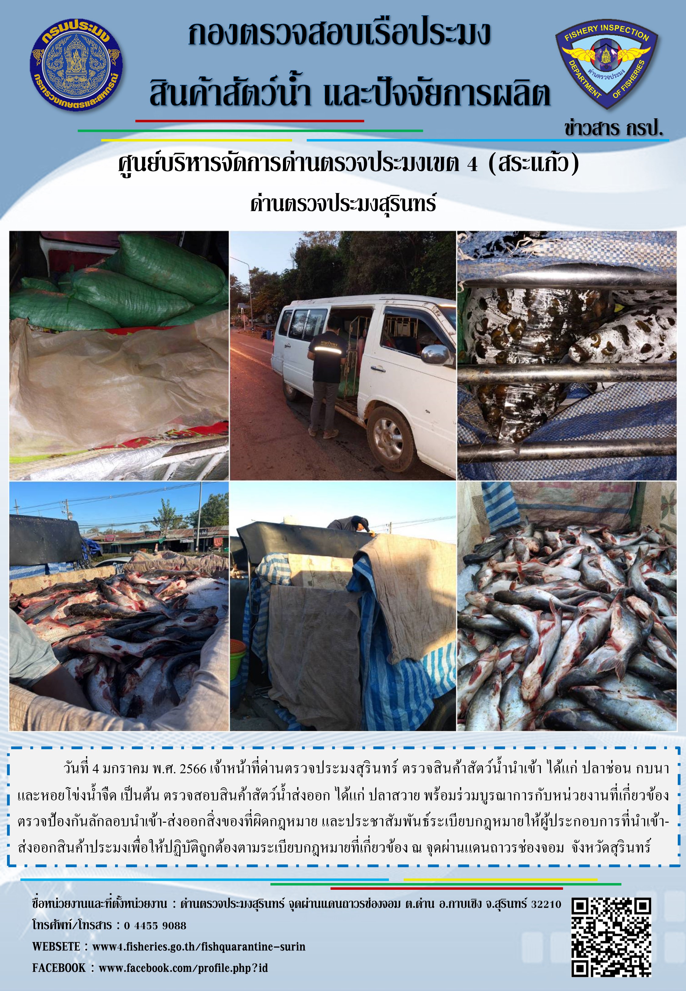 วันที่ 4 มกราคม พ.ศ. 2566 เจ้าหน้าที่ด่านตรวจประมงสุรินทร์ ตรวจสินค้าสัตว์น้ำนำเข้า ได้แก่ ปลาช่อน กบนา และหอยโข่งน้ำจืด เป็นต้น ตรวจสอบสินค้าสัตว์น้ำส่งออก ได้แก่ ปลาสวาย พร้อมร่วมบูรณาการกับหน่วยงานที่เกี่ยวข้องตรวจป้องกันลักลอบนำเข้า-ส่งออกสิ่งของที่ผิดกฎหมาย และประชาสัมพันธ์ระเบียบกฎหมายให้ผู้ประกอบการที่นำเข้า-ส่งออกสินค้าประมงเพื่อให้ปฏิบัติถูกต้องตามระเบียบกฎหมายที่เกี่ยวข้อง ณ จุดผ่านแดนถาวรช่องจอม จังหวัดสุรินทร์