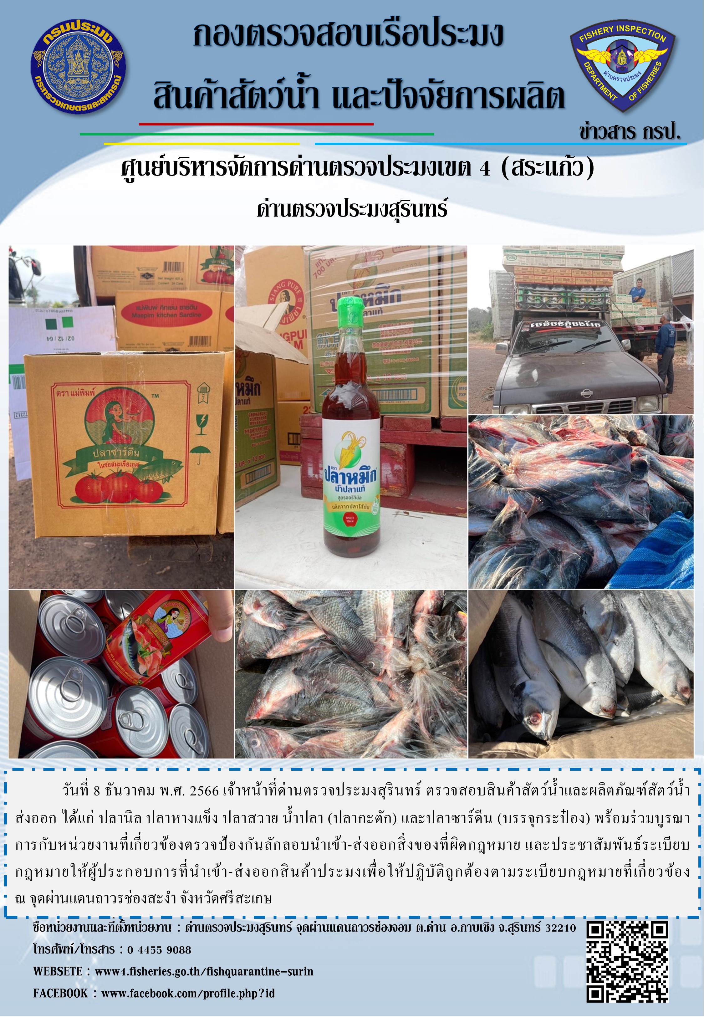 วันที่ 8 ธันวาคม พ.ศ. 2566 เจ้าหน้าที่ด่านตรวจประมงสุรินทร์ ตรวจสอบสินค้าสัตว์น้ำและผลิตภัณฑ์สัตว์น้ำส่งออก ได้แก่ ปลานิล ปลาหางแข็ง ปลาสวาย น้ำปลา (ปลากะตัก) และปลาซาร์ดีน (บรรจุกระป๋อง) พร้อมร่วมบูรณาการกับหน่วยงานที่เกี่ยวข้องตรวจป้องกันลักลอบนำเข้า-ส่งออกสิ่งของที่ผิดกฎหมาย และประชาสัมพันธ์ระเบียบกฎหมายให้ผู้ประกอบการที่นำเข้า-ส่งออกสินค้าประมงเพื่อให้ปฏิบัติถูกต้องตามระเบียบกฎหมายที่เกี่ยวข้อง ณ จุดผ่านแดนถาวรช่องสะงำ จังหวัดศรีสะเกษ
