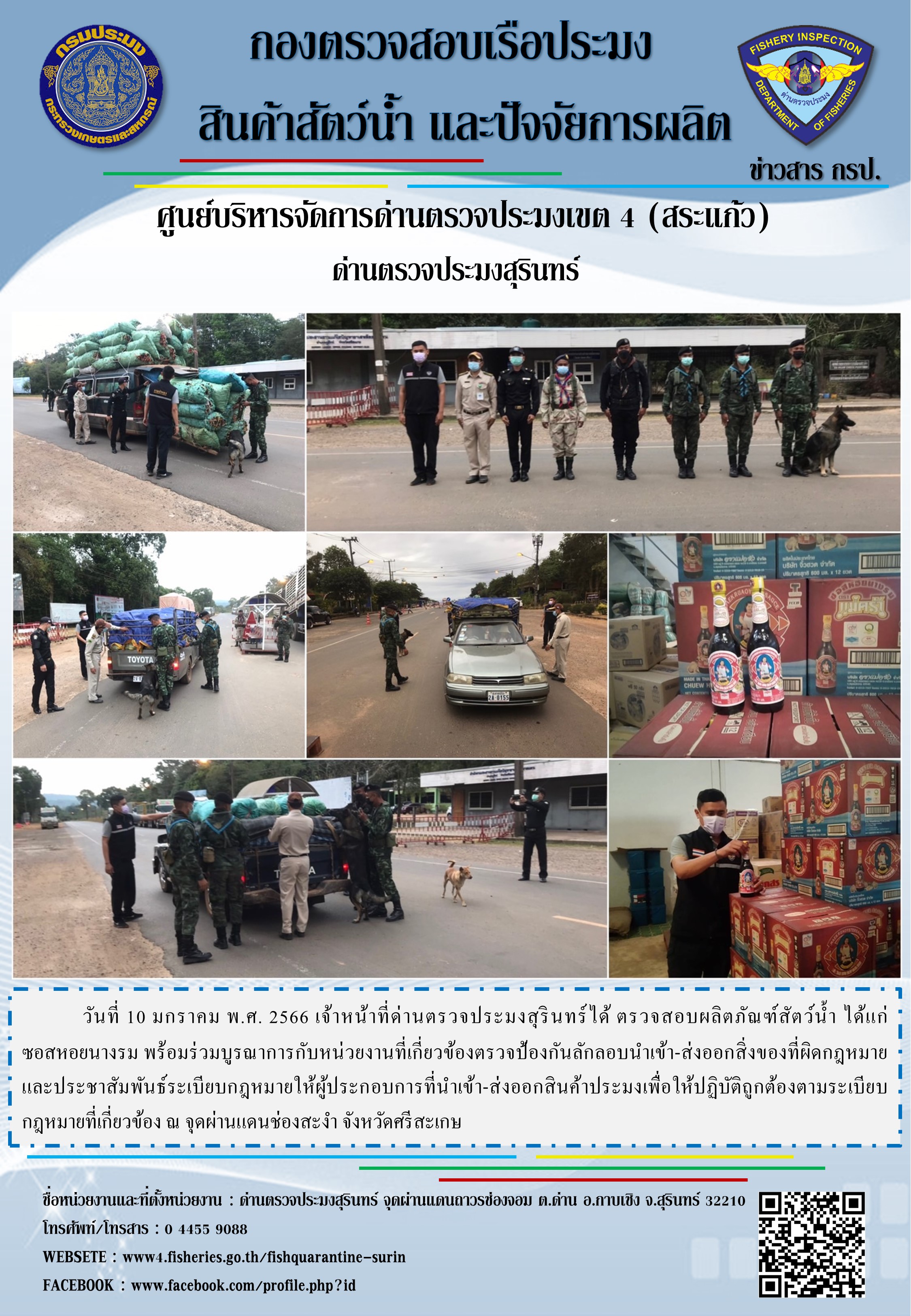 วันที่ 10 มกราคม พ.ศ. 2566 เจ้าหน้าที่ด่านตรวจประมงสุรินทร์ได้ ตรวจสอบผลิตภัณฑ์สัตว์น้ำ ได้แก่ ซอสหอยนางรม พร้อมร่วมบูรณาการกับหน่วยงานที่เกี่ยวข้องตรวจป้องกันลักลอบนำเข้า-ส่งออกสิ่งของที่ผิดกฎหมายและประชาสัมพันธ์ระเบียบกฎหมายให้ผู้ประกอบการที่นำเข้า-ส่งออกสินค้าประมงเพื่อให้ปฏิบัติถูกต้องตามระเบียบกฎหมายที่เกี่ยวข้อง ณ จุดผ่านแดนช่องสะงำ จังหวัดศรีสะเกษ
