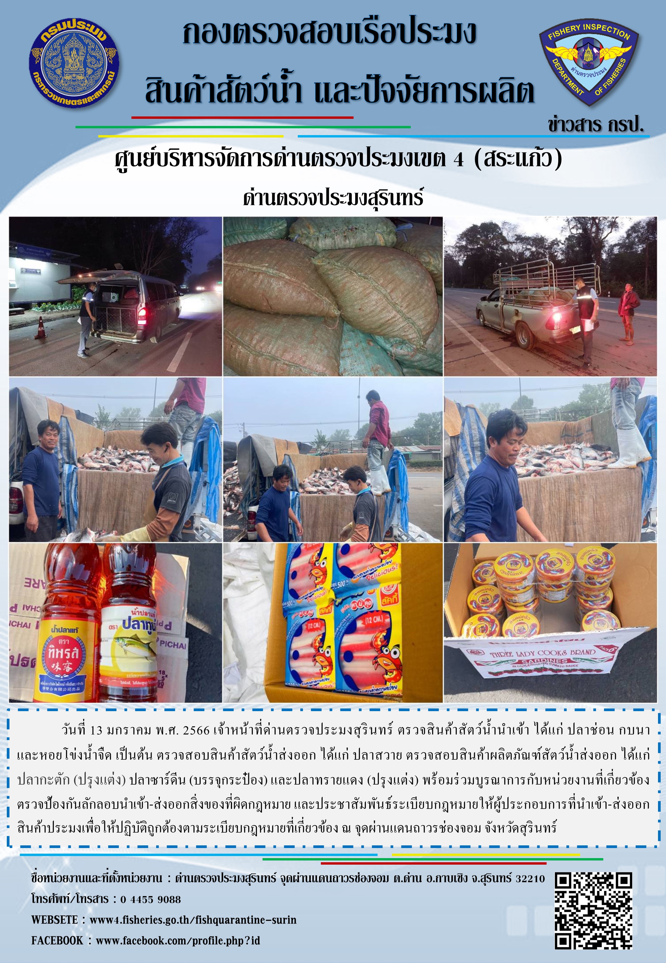 วันที่ 13 มกราคม พ.ศ. 2566 เจ้าหน้าที่ด่านตรวจประมงสุรินทร์ ตรวจสินค้าสัตว์น้ำนำเข้า ได้แก่ ปลาช่อน กบนา และหอยโข่งน้ำจืด เป็นต้น ตรวจสอบสินค้าสัตว์น้ำส่งออก ได้แก่ ปลาสวาย ตรวจสอบสินค้าผลิตภัณฑ์สัตว์น้ำส่งออก ได้แก่ ปลากะตัก (ปรุงแต่ง) ปลาซาร์ดีน (บรรจุกระป๋อง) และปลาทรายแดง (ปรุงแต่ง) พร้อมร่วมบูรณาการกับหน่วยงานที่เกี่ยวข้องตรวจป้องกันลักลอบนำเข้า-ส่งออกสิ่งของที่ผิดกฎหมาย และประชาสัมพันธ์ระเบียบกฎหมายให้ผู้ประกอบการที่นำเข้า-ส่งออกสินค้าประมงเพื่อให้ปฏิบัติถูกต้องตามระเบียบกฎหมายที่เกี่ยวข้อง ณ จุดผ่านแดนถาวรช่องจอม จังหวัดสุรินทร์