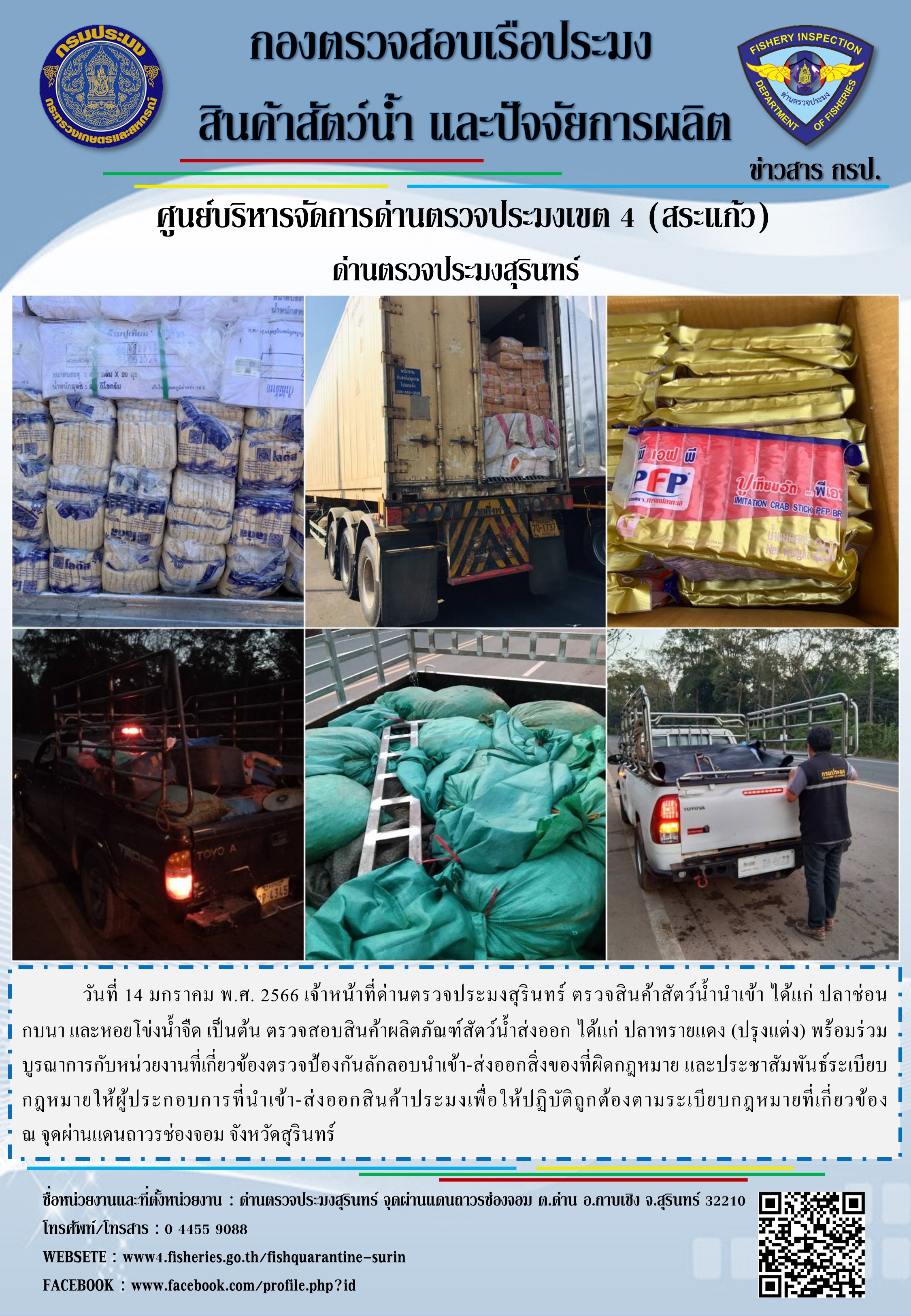 วันที่ 14 มกราคม พ.ศ. 2566 เจ้าหน้าที่ด่านตรวจประมงสุรินทร์ ตรวจสินค้าสัตว์น้ำนำเข้า ได้แก่ ปลาช่อน กบนา และหอยโข่งน้ำจืด เป็นต้น ตรวจสอบสินค้าผลิตภัณฑ์สัตว์น้ำส่งออก ได้แก่ ปลาทรายแดง (ปรุงแต่ง) พร้อมร่วมบูรณาการกับหน่วยงานที่เกี่ยวข้องตรวจป้องกันลักลอบนำเข้า-ส่งออกสิ่งของที่ผิดกฎหมาย และประชาสัมพันธ์ระเบียบกฎหมายให้ผู้ประกอบการที่นำเข้า-ส่งออกสินค้าประมงเพื่อให้ปฏิบัติถูกต้องตามระเบียบกฎหมายที่เกี่ยวข้อง ณ จุดผ่านแดนถาวรช่องจอม จังหวัดสุรินทร์