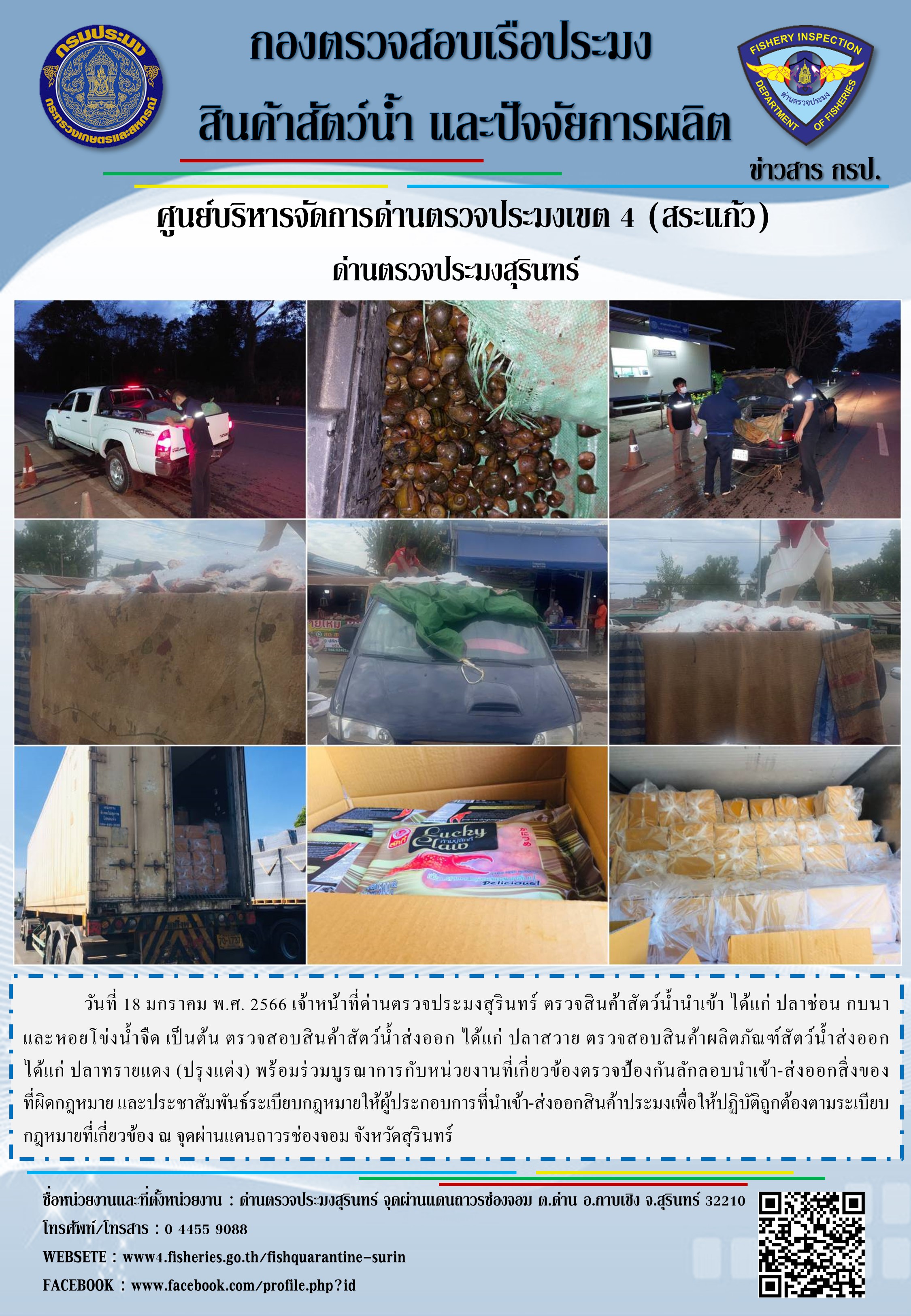 วันที่ 18 มกราคม พ.ศ. 2566 เจ้าหน้าที่ด่านตรวจประมงสุรินทร์ ตรวจสินค้าสัตว์น้ำนำเข้า ได้แก่ ปลาช่อน กบนา และหอยโข่งน้ำจืด เป็นต้น ตรวจสอบสินค้าสัตว์น้ำส่งออก ได้แก่ ปลาสวาย ตรวจสอบสินค้าผลิตภัณฑ์สัตว์น้ำส่งออก ได้แก่ ปลาทรายแดง (ปรุงแต่ง) พร้อมร่วมบูรณาการกับหน่วยงานที่เกี่ยวข้องตรวจป้องกันลักลอบนำเข้า-ส่งออกสิ่งของที่ผิดกฎหมาย และประชาสัมพันธ์ระเบียบกฎหมายให้ผู้ประกอบการที่นำเข้า-ส่งออกสินค้าประมงเพื่อให้ปฏิบัติถูกต้องตามระเบียบกฎหมายที่เกี่ยวข้อง ณ จุดผ่านแดนถาวรช่องจอม จังหวัดสุรินทร์