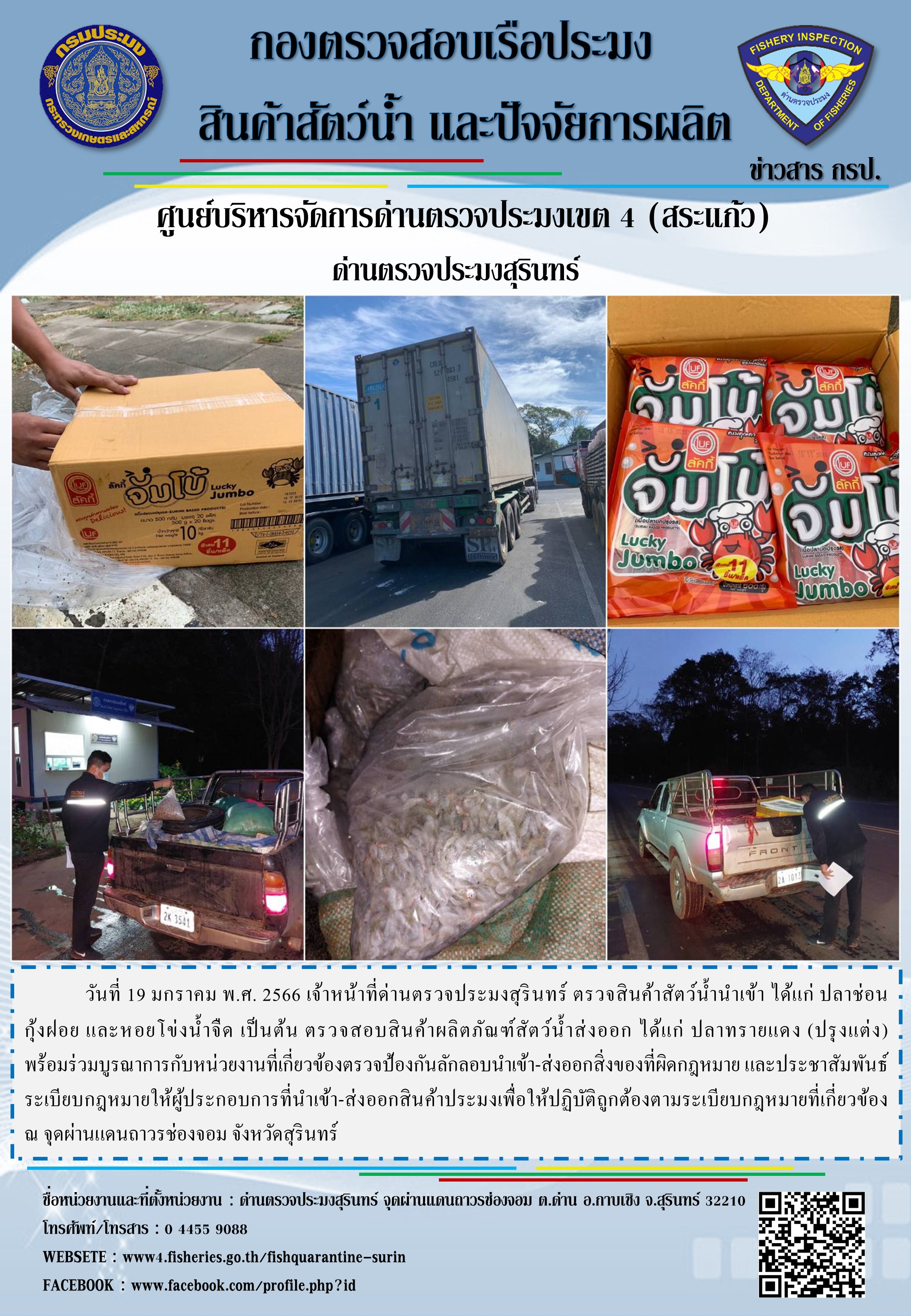 วันที่ 19 มกราคม พ.ศ. 2566 เจ้าหน้าที่ด่านตรวจประมงสุรินทร์ ตรวจสินค้าสัตว์น้ำนำเข้า ได้แก่ ปลาช่อน กุ้งฝอย และหอยโข่งน้ำจืด เป็นต้น ตรวจสอบสินค้าผลิตภัณฑ์สัตว์น้ำส่งออก ได้แก่ ปลาทรายแดง (ปรุงแต่ง) พร้อมร่วมบูรณาการกับหน่วยงานที่เกี่ยวข้องตรวจป้องกันลักลอบนำเข้า-ส่งออกสิ่งของที่ผิดกฎหมาย และประชาสัมพันธ์ระเบียบกฎหมายให้ผู้ประกอบการที่นำเข้า-ส่งออกสินค้าประมงเพื่อให้ปฏิบัติถูกต้องตามระเบียบกฎหมายที่เกี่ยวข้อง ณ จุดผ่านแดนถาวรช่องจอม จังหวัดสุรินทร์