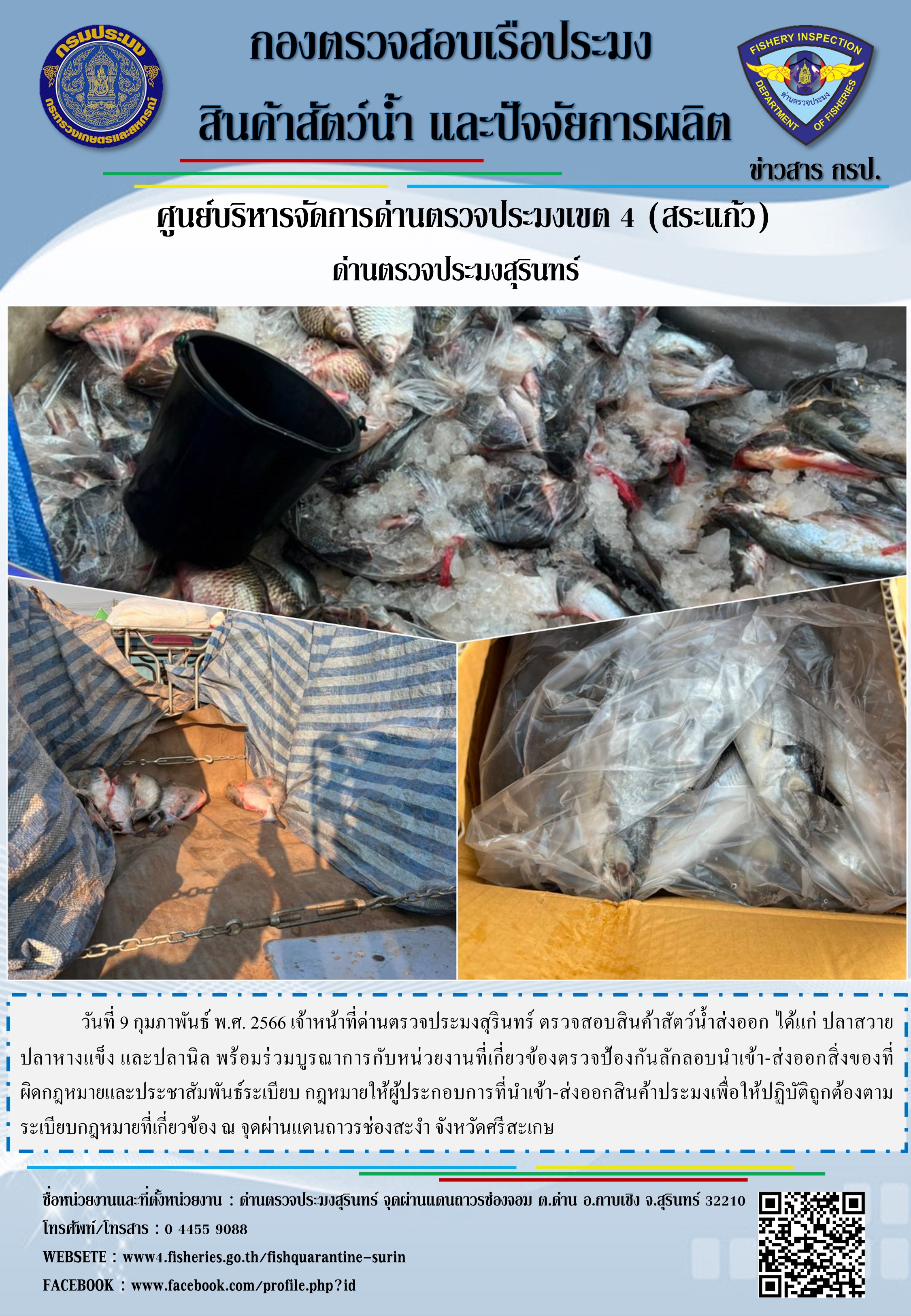 วันที่ 9 กุมภาพันธ์ พ.ศ. 2566 เจ้าหน้าที่ด่านตรวจประมงสุรินทร์ ตรวจสอบสินค้าสัตว์น้ำส่งออก ได้แก่ ปลาสวาย ปลาหางแข็ง และปลานิล พร้อมร่วมบูรณาการกับหน่วยงานที่เกี่ยวข้องตรวจป้องกันลักลอบนำเข้า-ส่งออกสิ่งของที่ผิดกฎหมายและประชาสัมพันธ์ระเบียบ กฎหมายให้ผู้ประกอบการที่นำเข้า-ส่งออกสินค้าประมงเพื่อให้ปฏิบัติถูกต้องตามระเบียบกฎหมายที่เกี่ยวข้อง ณ จุดผ่านแดนถาวรช่องสะงำ จังหวัดศรีสะเกษ