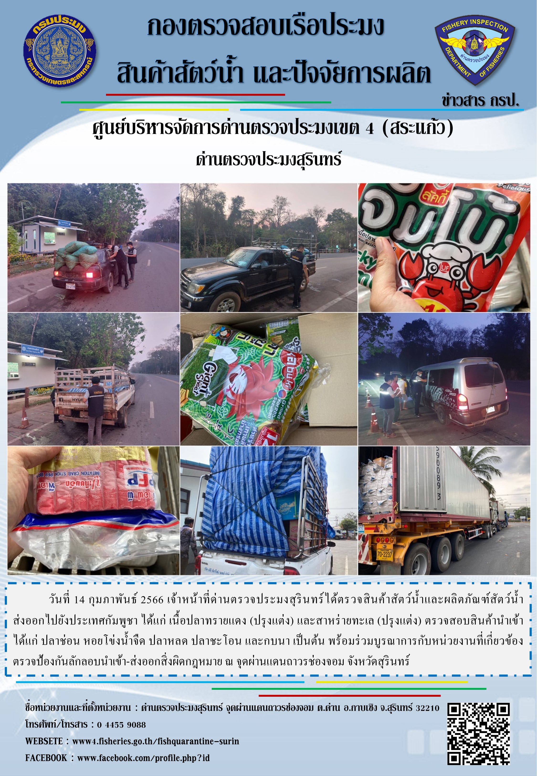 ผลการปฏิบัติงานด่านตรวจประมงสุรินทร์ วันที่ 14 กุมภาพันธ์ พ.ศ.2566 ณ จุดผ่านแดนถาวรช่องจอม