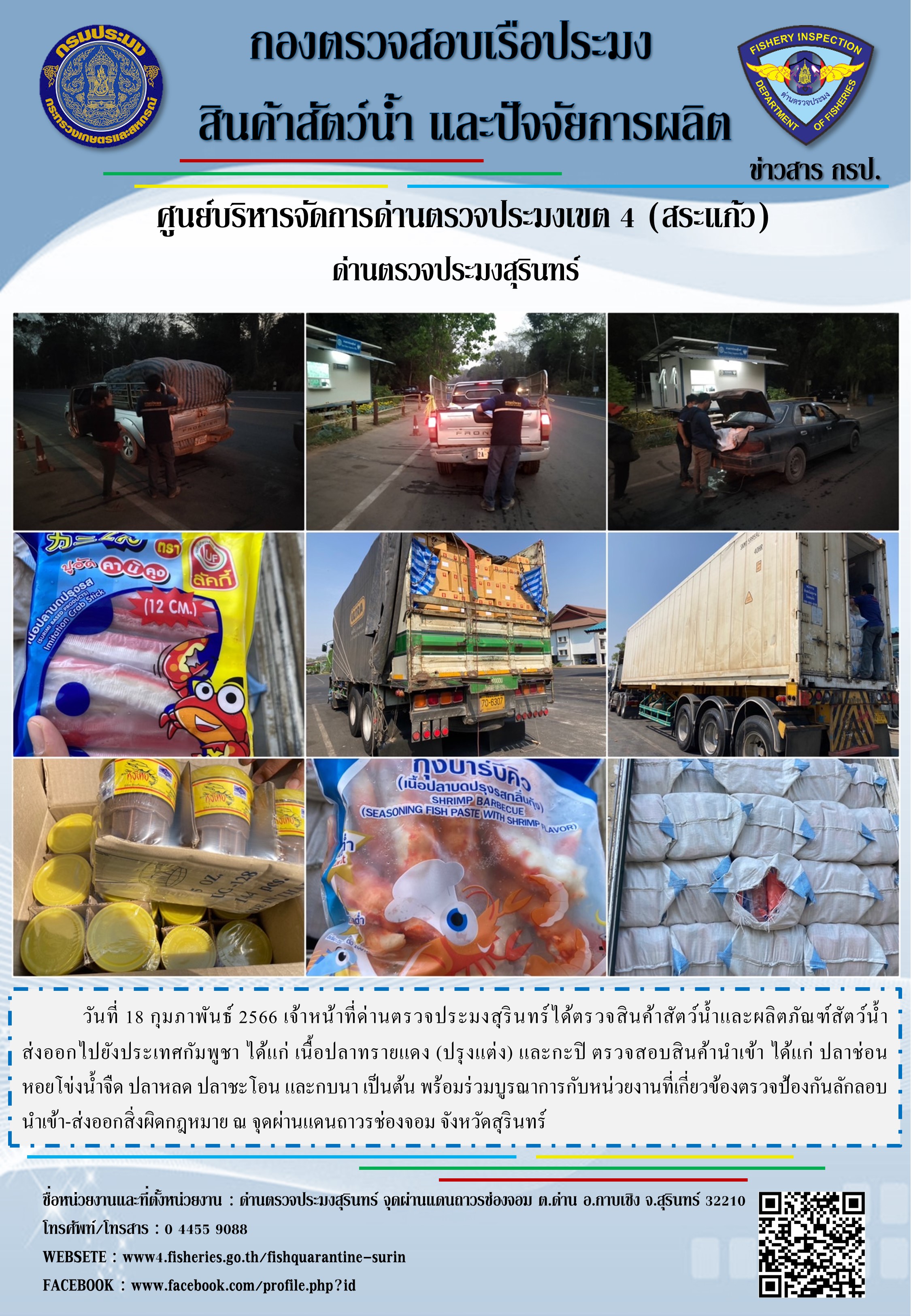 ผลการปฏิบัติงานด่านตรวจประมงสุรินทร์ วันที่ 18 กุมภาพันธ์ พ.ศ.2566 ณ จุดผ่านแดนถาวรช่องจอม