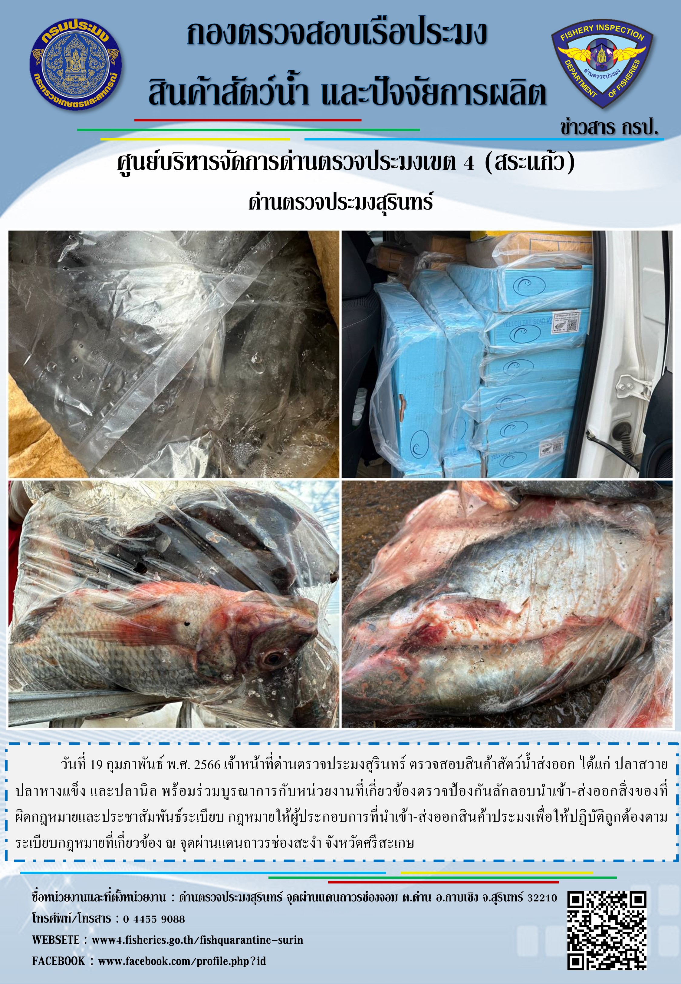 วันที่ 19 กุมภาพันธ์ พ.ศ. 2566 เจ้าหน้าที่ด่านตรวจประมงสุรินทร์ ตรวจสอบสินค้าสัตว์น้ำส่งออก ได้แก่ ปลาสวาย ปลาหางแข็ง และปลานิล พร้อมร่วมบูรณาการกับหน่วยงานที่เกี่ยวข้องตรวจป้องกันลักลอบนำเข้า-ส่งออกสิ่งของที่ผิดกฎหมายและประชาสัมพันธ์ระเบียบ กฎหมายให้ผู้ประกอบการที่นำเข้า-ส่งออกสินค้าประมงเพื่อให้ปฏิบัติถูกต้องตามระเบียบกฎหมายที่เกี่ยวข้อง ณ จุดผ่านแดนถาวรช่องสะงำ จังหวัดศรีสะเกษ