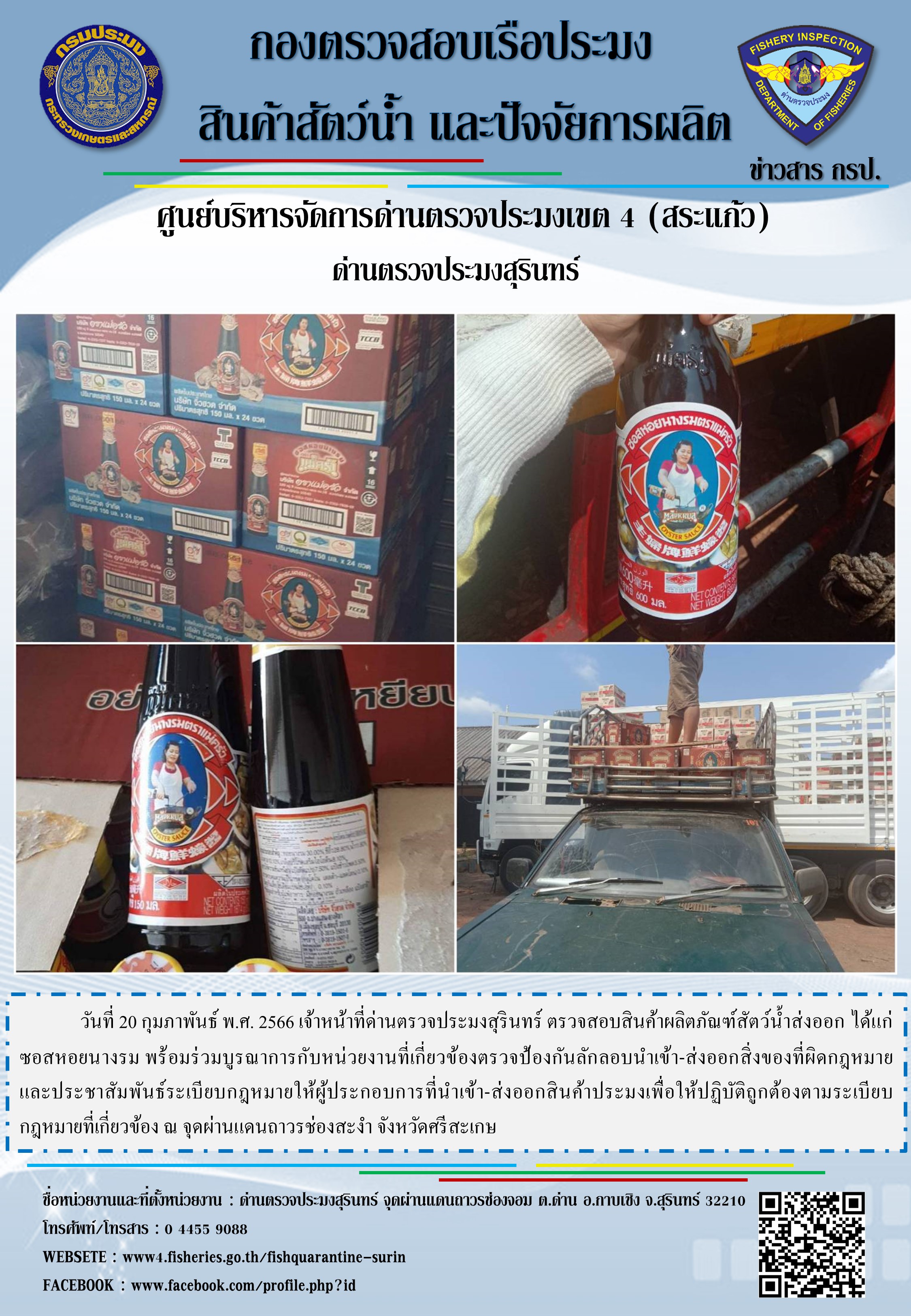 วันที่ 20 กุมภาพันธ์ พ.ศ. 2566 เจ้าหน้าที่ด่านตรวจประมงสุรินทร์ ตรวจสอบสินค้าผลิตภัณฑ์สัตว์น้ำส่งออก ได้แก่ ซอสหอยนางรม พร้อมร่วมบูรณาการกับหน่วยงานที่เกี่ยวข้องตรวจป้องกันลักลอบนำเข้า-ส่งออกสิ่งของที่ผิดกฎหมาย และประชาสัมพันธ์ระเบียบกฎหมายให้ผู้ประกอบการที่นำเข้า-ส่งออกสินค้าประมงเพื่อให้ปฏิบัติถูกต้องตามระเบียบกฎหมายที่เกี่ยวข้อง ณ จุดผ่านแดนถาวรช่องสะงำ จังหวัดศรีสะเกษ