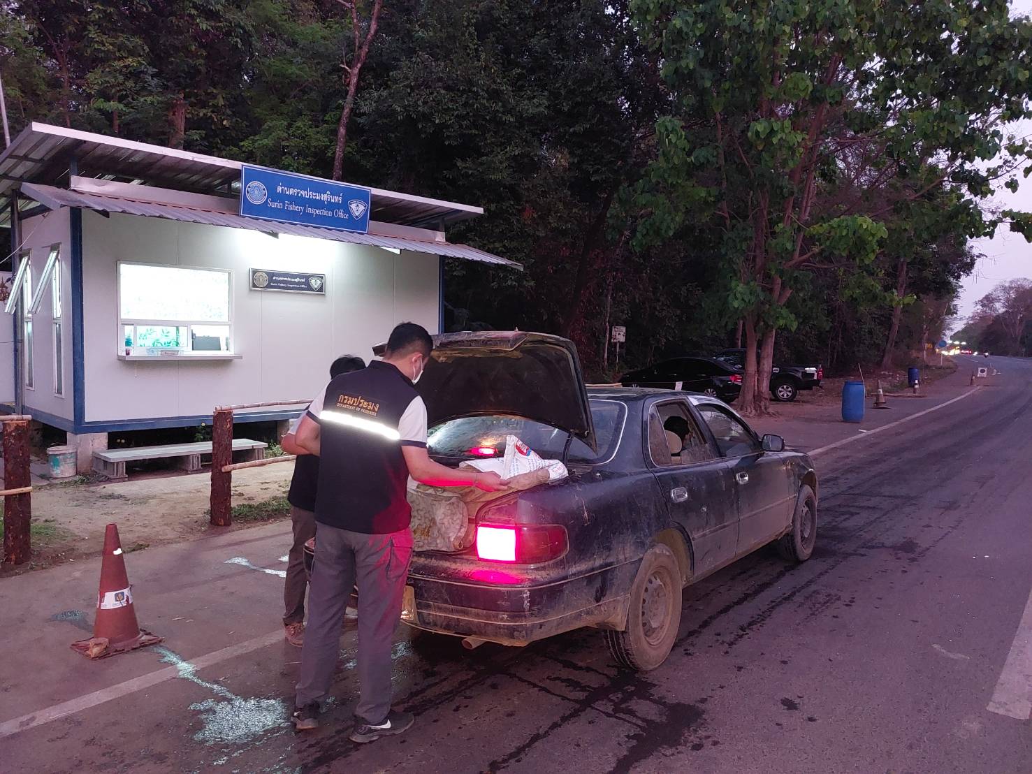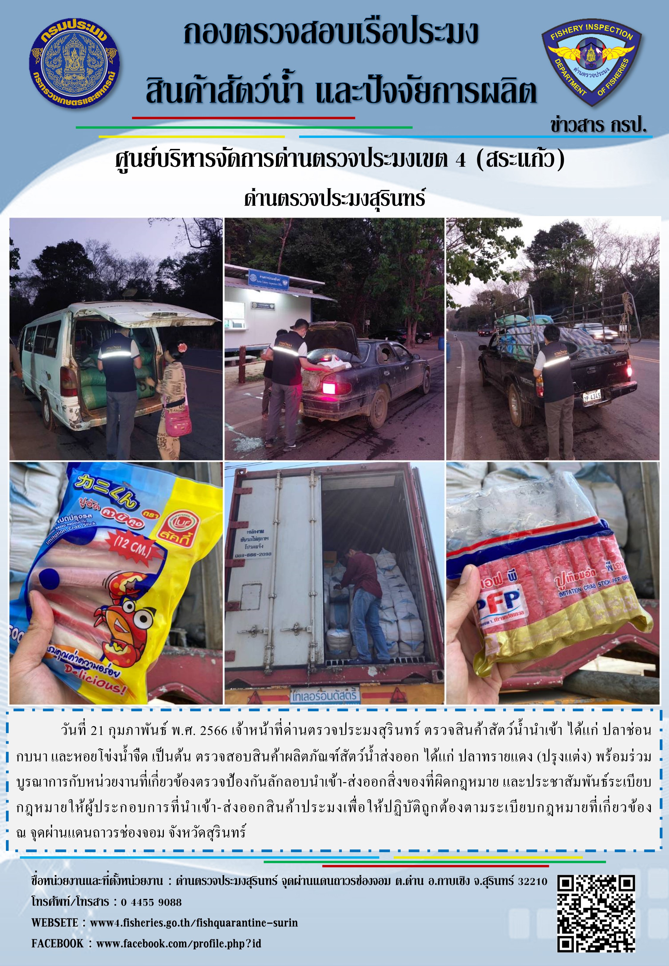 วันที่ 21 กุมภาพันธ์ พ.ศ. 2566 เจ้าหน้าที่ด่านตรวจประมงสุรินทร์ ตรวจสินค้าสัตว์น้ำนำเข้า ได้แก่ ปลาช่อน กบนา และหอยโข่งน้ำจืด เป็นต้น ตรวจสอบสินค้าผลิตภัณฑ์สัตว์น้ำส่งออก ได้แก่ ปลาทรายแดง (ปรุงแต่ง) พร้อมร่วมบูรณาการกับหน่วยงานที่เกี่ยวข้องตรวจป้องกันลักลอบนำเข้า-ส่งออกสิ่งของที่ผิดกฎหมาย และประชาสัมพันธ์ระเบียบกฎหมายให้ผู้ประกอบการที่นำเข้า-ส่งออกสินค้าประมงเพื่อให้ปฏิบัติถูกต้องตามระเบียบกฎหมายที่เกี่ยวข้อง ณ จุดผ่านแดนถาวรช่องจอม จังหวัดสุรินทร์