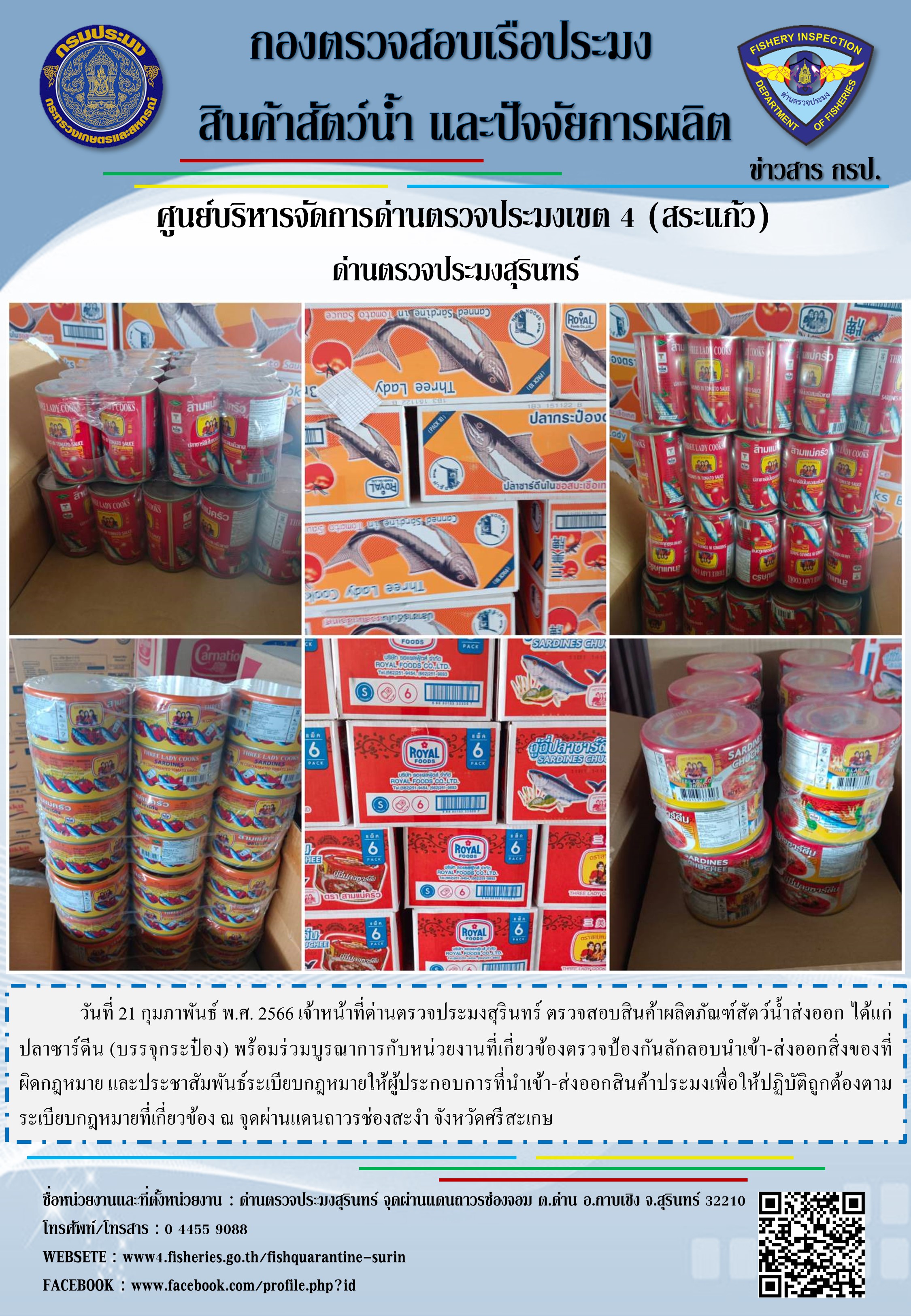 วันที่ 21 กุมภาพันธ์ พ.ศ. 2566 เจ้าหน้าที่ด่านตรวจประมงสุรินทร์ ตรวจสอบสินค้าผลิตภัณฑ์สัตว์น้ำส่งออก ได้แก่ ปลาซาร์ดีน (บรรจุกระป๋อง) พร้อมร่วมบูรณาการกับหน่วยงานที่เกี่ยวข้องตรวจป้องกันลักลอบนำเข้า-ส่งออกสิ่งของที่ผิดกฎหมาย และประชาสัมพันธ์ระเบียบกฎหมายให้ผู้ประกอบการที่นำเข้า-ส่งออกสินค้าประมงเพื่อให้ปฏิบัติถูกต้องตามระเบียบกฎหมายที่เกี่ยวข้อง ณ จุดผ่านแดนถาวรช่องสะงำ จังหวัดศรีสะเกษ