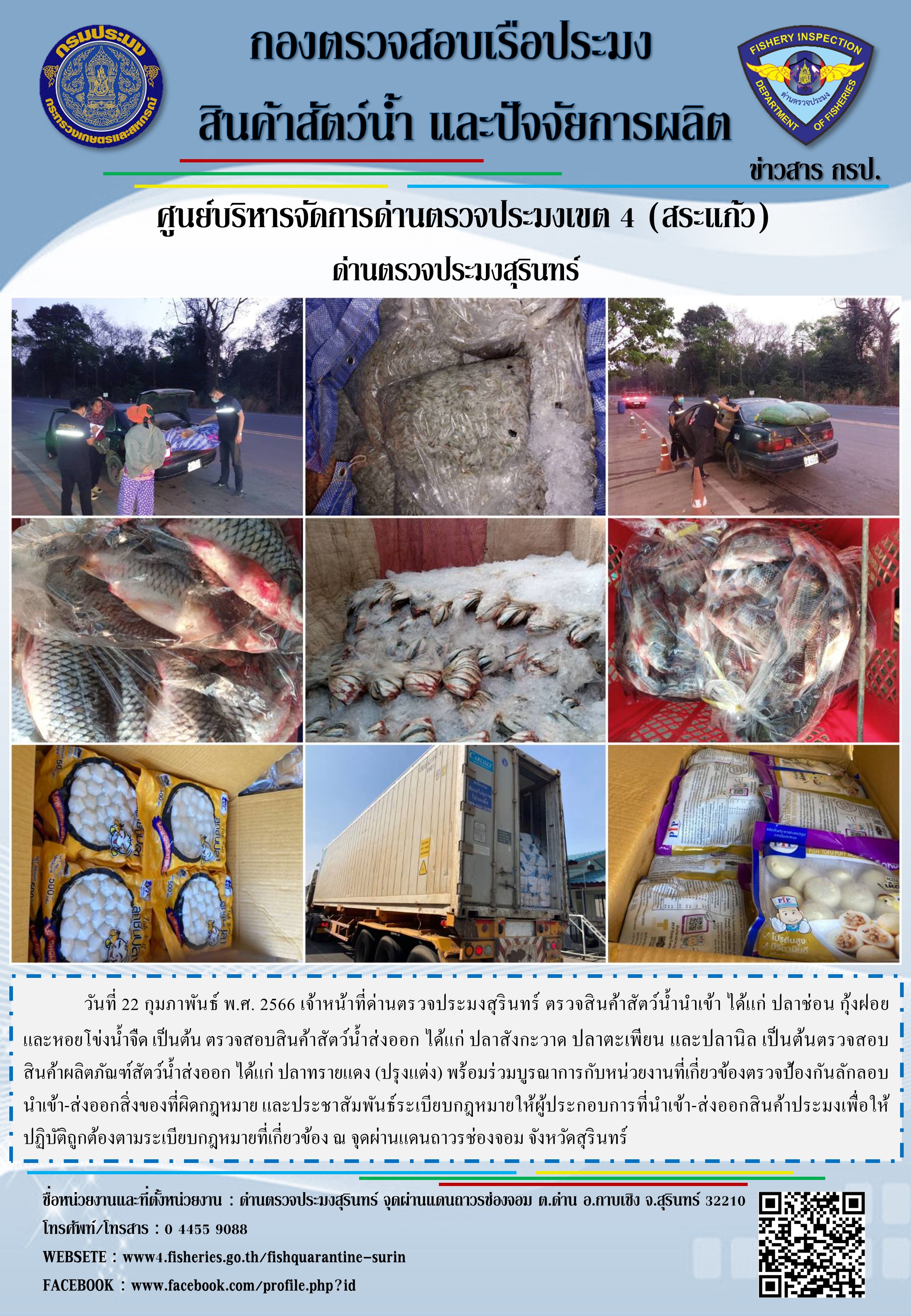 ผลการปฏิบัติงานด่านตรวจประมงสุรินทร์ วันที่ 22 กุมภาพันธ์ พ.ศ.2566 ณ จุดผ่านแดนถาวรช่องสะงำ