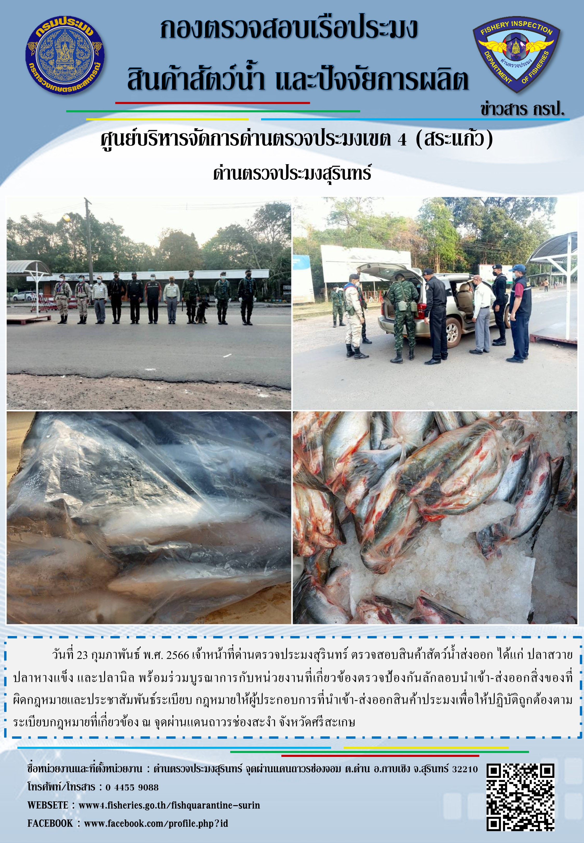 วันที่ 23 กุมภาพันธ์ พ.ศ. 2566 เจ้าหน้าที่ด่านตรวจประมงสุรินทร์ ตรวจสอบสินค้าสัตว์น้ำส่งออก ได้แก่ ปลาสวาย ปลาหางแข็ง และปลานิล พร้อมร่วมบูรณาการกับหน่วยงานที่เกี่ยวข้องตรวจป้องกันลักลอบนำเข้า-ส่งออกสิ่งของที่ผิดกฎหมายและประชาสัมพันธ์ระเบียบ กฎหมายให้ผู้ประกอบการที่นำเข้า-ส่งออกสินค้าประมงเพื่อให้ปฏิบัติถูกต้องตามระเบียบกฎหมายที่เกี่ยวข้อง ณ จุดผ่านแดนถาวรช่องสะงำ จังหวัดศรีสะเกษ