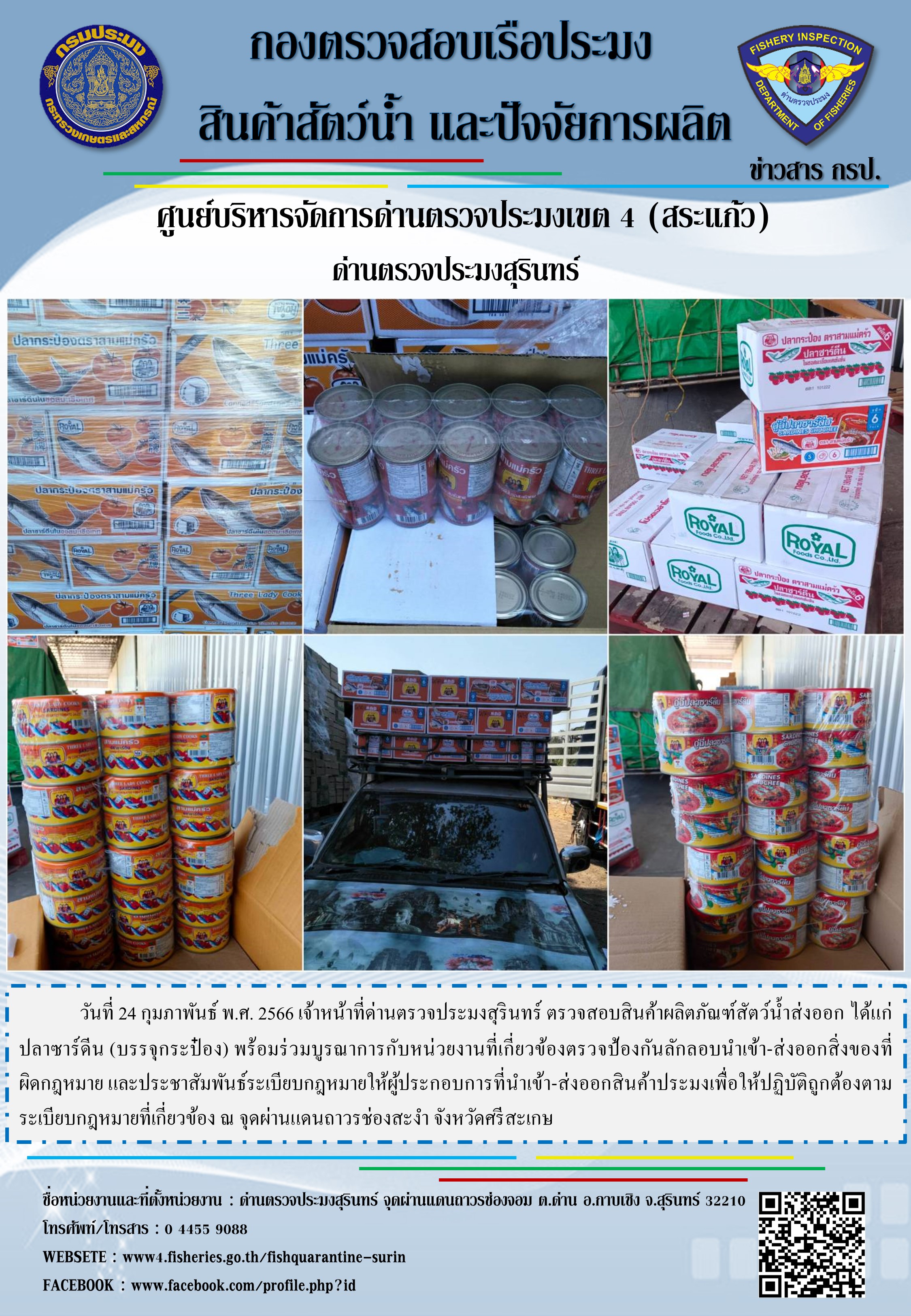วันที่ 24 กุมภาพันธ์ พ.ศ. 2566 เจ้าหน้าที่ด่านตรวจประมงสุรินทร์ ตรวจสอบสินค้าผลิตภัณฑ์สัตว์น้ำส่งออก ได้แก่ ปลาซาร์ดีน (บรรจุกระป๋อง) พร้อมร่วมบูรณาการกับหน่วยงานที่เกี่ยวข้องตรวจป้องกันลักลอบนำเข้า-ส่งออกสิ่งของที่ผิดกฎหมาย และประชาสัมพันธ์ระเบียบกฎหมายให้ผู้ประกอบการที่นำเข้า-ส่งออกสินค้าประมงเพื่อให้ปฏิบัติถูกต้องตามระเบียบกฎหมายที่เกี่ยวข้อง ณ จุดผ่านแดนถาวรช่องสะงำ จังหวัดศรีสะเกษ