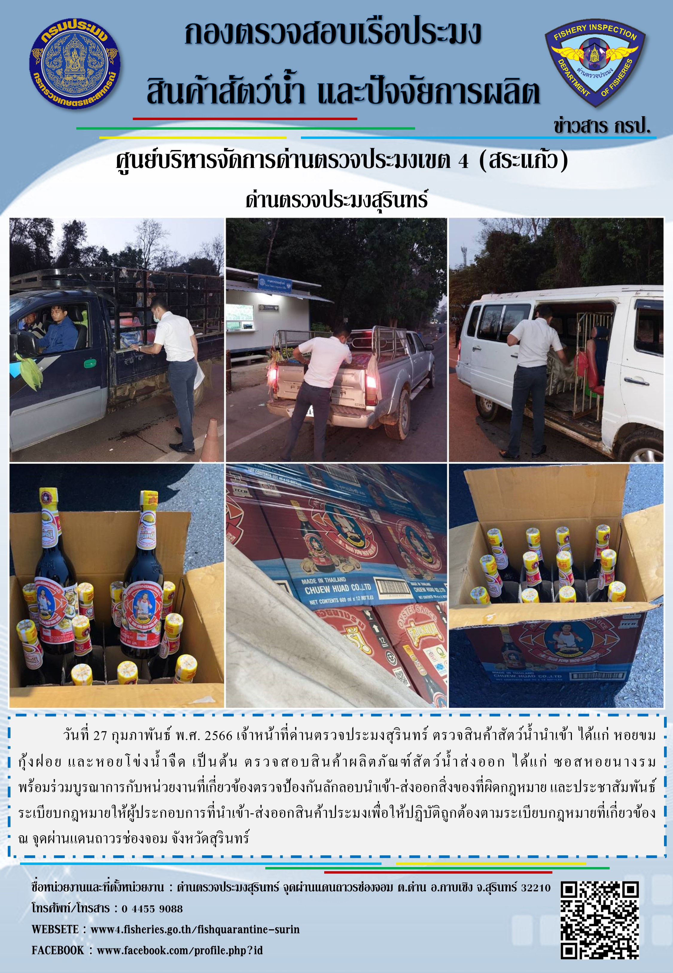 วันที่ 27 กุมภาพันธ์ พ.ศ. 2566 เจ้าหน้าที่ด่านตรวจประมงสุรินทร์ ตรวจสินค้าสัตว์น้ำนำเข้า ได้แก่ หอยขม กุ้งฝอย และหอยโข่งน้ำจืด เป็นต้น ตรวจสอบสินค้าผลิตภัณฑ์สัตว์น้ำส่งออก ได้แก่ ซอสหอยนางรม พร้อมร่วมบูรณาการกับหน่วยงานที่เกี่ยวข้องตรวจป้องกันลักลอบนำเข้า-ส่งออกสิ่งของที่ผิดกฎหมาย และประชาสัมพันธ์ระเบียบกฎหมายให้ผู้ประกอบการที่นำเข้า-ส่งออกสินค้าประมงเพื่อให้ปฏิบัติถูกต้องตามระเบียบกฎหมายที่เกี่ยวข้อง ณ จุดผ่านแดนถาวรช่องจอม จังหวัดสุรินทร์