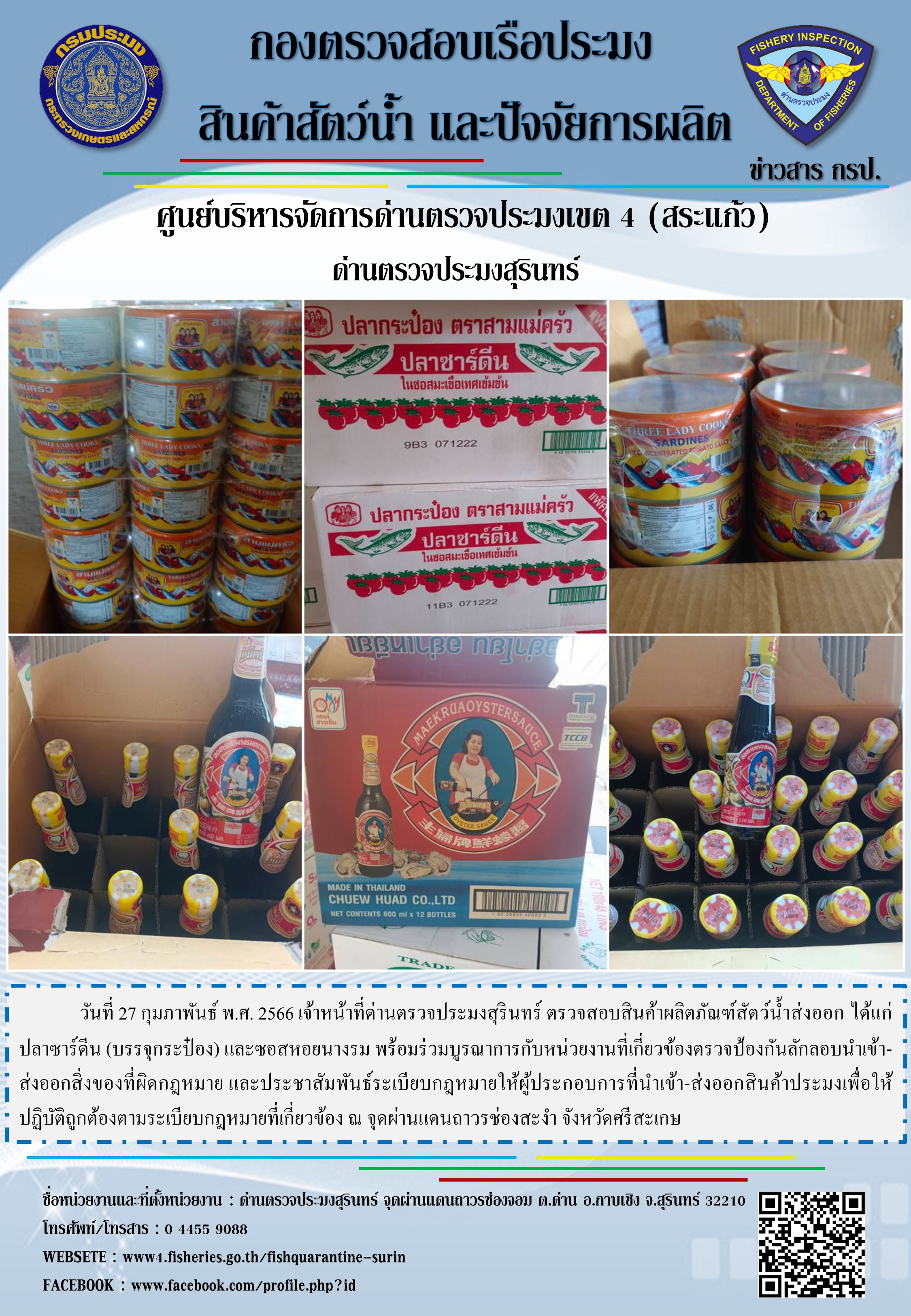 วันที่ 27 กุมภาพันธ์ พ.ศ. 2566 เจ้าหน้าที่ด่านตรวจประมงสุรินทร์ ตรวจสอบสินค้าผลิตภัณฑ์สัตว์น้ำส่งออก ได้แก่ ปลาซาร์ดีน (บรรจุกระป๋อง) และซอสหอยนางรม พร้อมร่วมบูรณาการกับหน่วยงานที่เกี่ยวข้องตรวจป้องกันลักลอบนำเข้า-ส่งออกสิ่งของที่ผิดกฎหมาย และประชาสัมพันธ์ระเบียบกฎหมายให้ผู้ประกอบการที่นำเข้า-ส่งออกสินค้าประมงเพื่อให้ปฏิบัติถูกต้องตามระเบียบกฎหมายที่เกี่ยวข้อง ณ จุดผ่านแดนถาวรช่องสะงำ จังหวัดศรีสะเกษ