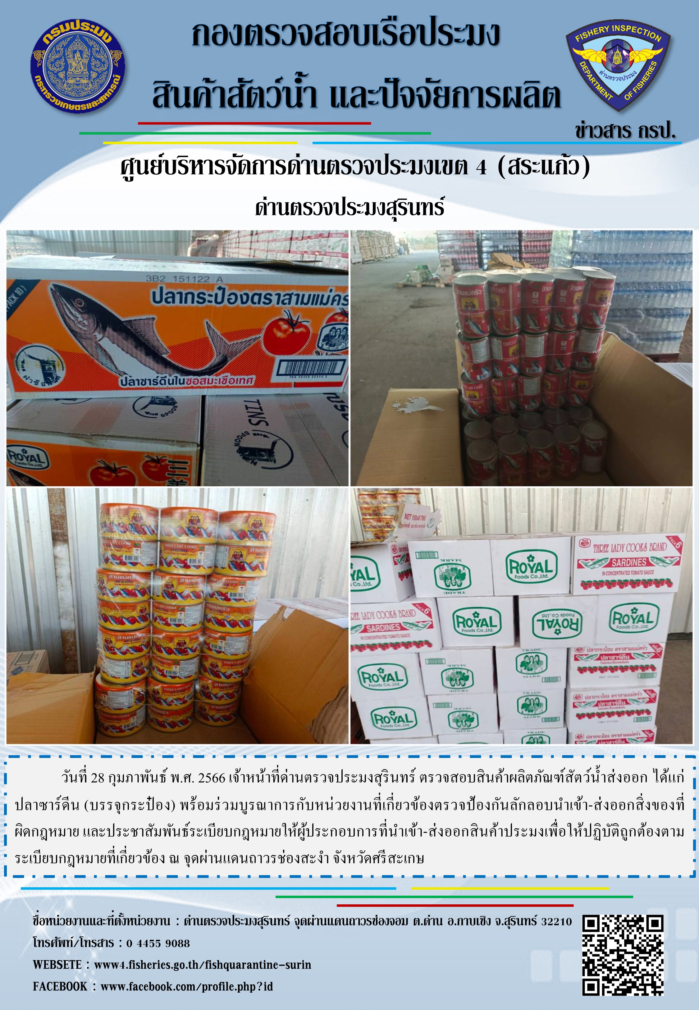 วันที่ 28 กุมภาพันธ์ พ.ศ. 2566 เจ้าหน้าที่ด่านตรวจประมงสุรินทร์ ตรวจสอบสินค้าผลิตภัณฑ์สัตว์น้ำส่งออก ได้แก่ ปลาซาร์ดีน (บรรจุกระป๋อง) พร้อมร่วมบูรณาการกับหน่วยงานที่เกี่ยวข้องตรวจป้องกันลักลอบนำเข้า-ส่งออกสิ่งของที่ผิดกฎหมาย และประชาสัมพันธ์ระเบียบกฎหมายให้ผู้ประกอบการที่นำเข้า-ส่งออกสินค้าประมงเพื่อให้ปฏิบัติถูกต้องตามระเบียบกฎหมายที่เกี่ยวข้อง ณ จุดผ่านแดนถาวรช่องสะงำ จังหวัดศรีสะเกษ