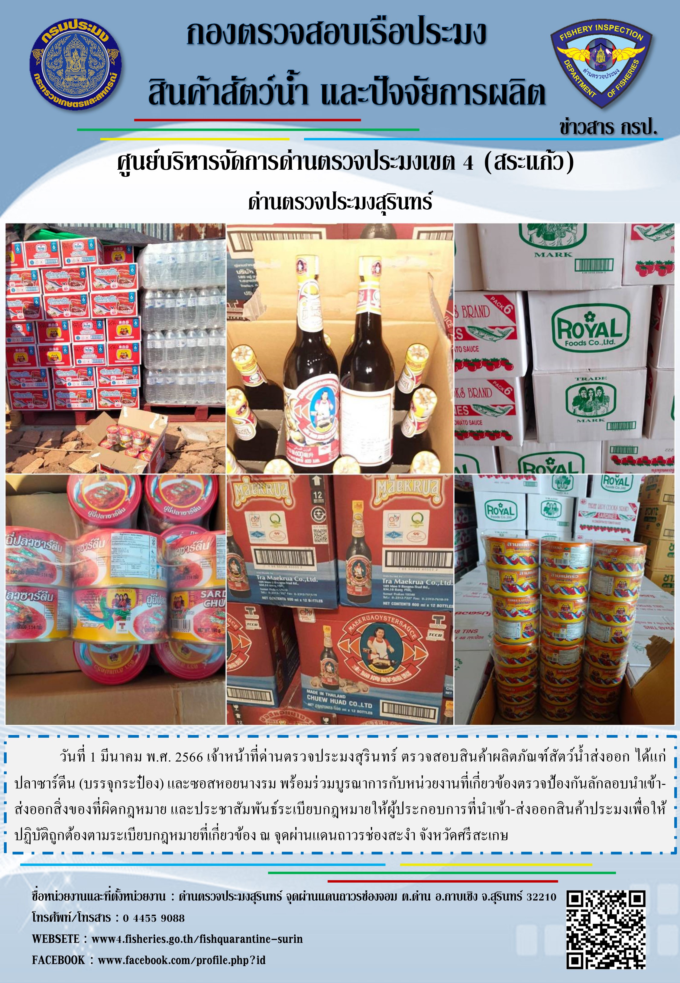 วันที่ 1 มีนาคม พ.ศ. 2566 เจ้าหน้าที่ด่านตรวจประมงสุรินทร์ ตรวจสอบสินค้าผลิตภัณฑ์สัตว์น้ำส่งออก ได้แก่ ปลาซาร์ดีน (บรรจุกระป๋อง) และซอสหอยนางรม พร้อมร่วมบูรณาการกับหน่วยงานที่เกี่ยวข้องตรวจป้องกันลักลอบนำเข้า-ส่งออกสิ่งของที่ผิดกฎหมาย และประชาสัมพันธ์ระเบียบกฎหมายให้ผู้ประกอบการที่นำเข้า-ส่งออกสินค้าประมงเพื่อให้ปฏิบัติถูกต้องตามระเบียบกฎหมายที่เกี่ยวข้อง ณ จุดผ่านแดนถาวรช่องสะงำ จังหวัดศรีสะเกษ