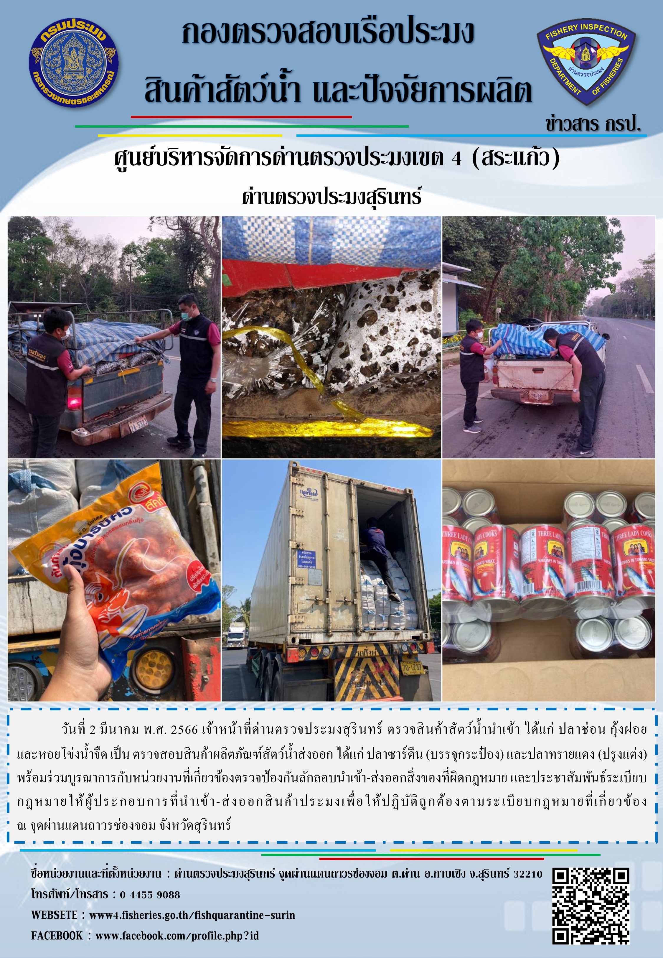 วันที่ 2 มีนาคม พ.ศ. 2566 เจ้าหน้าที่ด่านตรวจประมงสุรินทร์ ตรวจสินค้าสัตว์น้ำนำเข้า ได้แก่ ปลาช่อน กุ้งฝอย และหอยโข่งน้ำจืด เป็น ตรวจสอบสินค้าผลิตภัณฑ์สัตว์น้ำส่งออก ได้แก่ ปลาซาร์ดีน (บรรจุกระป๋อง) และปลาทรายแดง (ปรุงแต่ง) พร้อมร่วมบูรณาการกับหน่วยงานที่เกี่ยวข้องตรวจป้องกันลักลอบนำเข้า-ส่งออกสิ่งของที่ผิดกฎหมาย และประชาสัมพันธ์ระเบียบกฎหมายให้ผู้ประกอบการที่นำเข้า-ส่งออกสินค้าประมงเพื่อให้ปฏิบัติถูกต้องตามระเบียบกฎหมายที่เกี่ยวข้อง ณ จุดผ่านแดนถาวรช่องจอม จังหวัดสุรินทร์