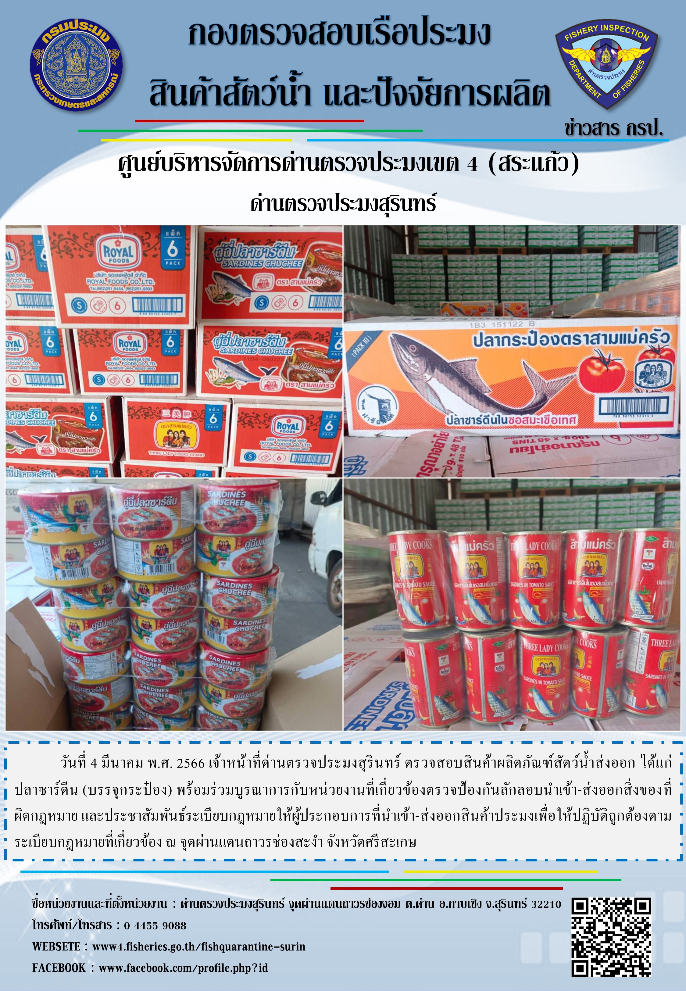 วันที่ 4 มีนาคม พ.ศ. 2566 เจ้าหน้าที่ด่านตรวจประมงสุรินทร์ ตรวจสอบสินค้าผลิตภัณฑ์สัตว์น้ำส่งออก ได้แก่ ปลาซาร์ดีน (บรรจุกระป๋อง) พร้อมร่วมบูรณาการกับหน่วยงานที่เกี่ยวข้องตรวจป้องกันลักลอบนำเข้า-ส่งออกสิ่งของที่ผิดกฎหมาย และประชาสัมพันธ์ระเบียบกฎหมายให้ผู้ประกอบการที่นำเข้า-ส่งออกสินค้าประมงเพื่อให้ปฏิบัติถูกต้องตามระเบียบกฎหมายที่เกี่ยวข้อง ณ จุดผ่านแดนถาวรช่องสะงำ จังหวัดศรีสะเกษ