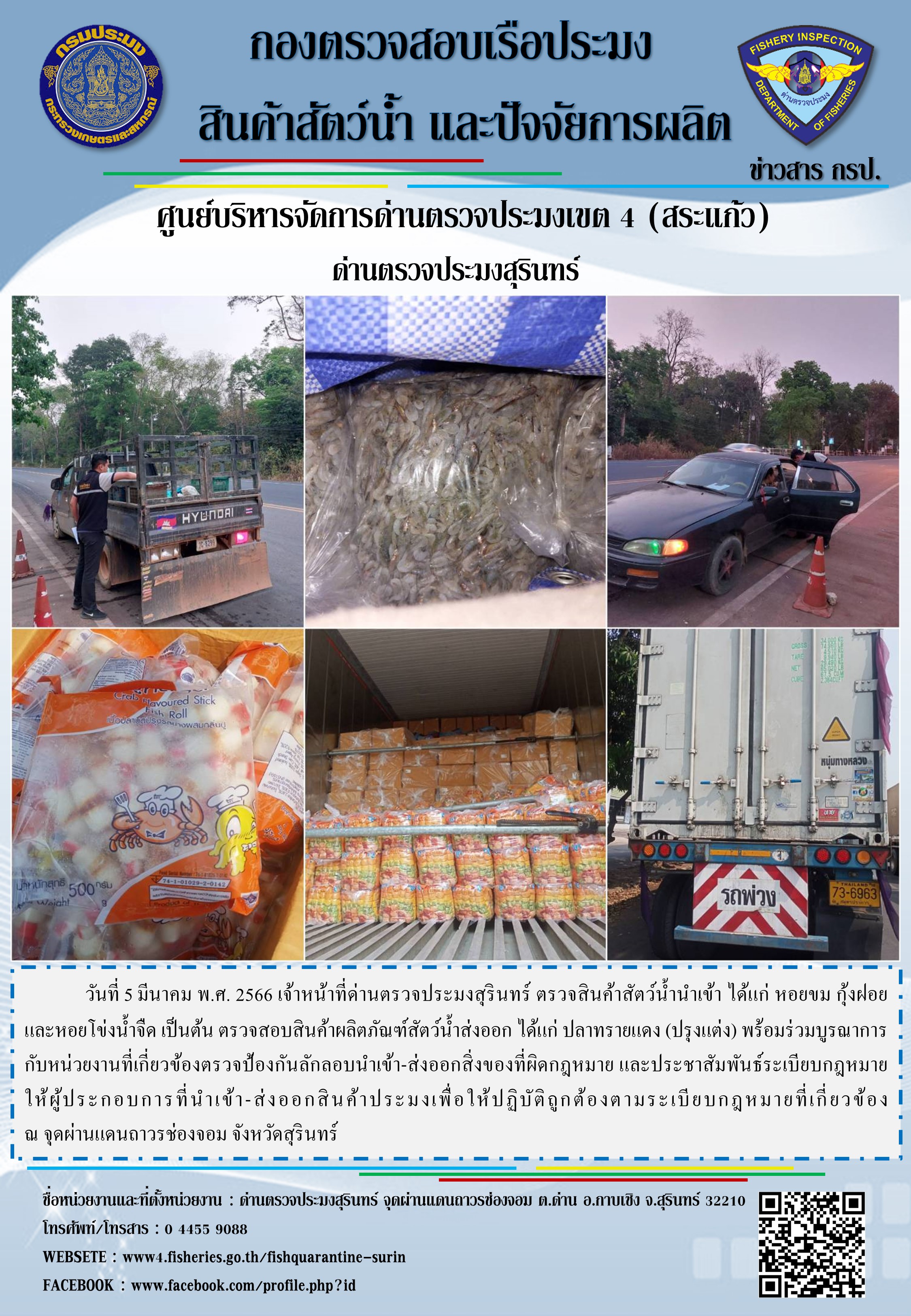 วันที่ 5 มีนาคม พ.ศ. 2566 เจ้าหน้าที่ด่านตรวจประมงสุรินทร์ ตรวจสินค้าสัตว์น้ำนำเข้า ได้แก่ หอยขม กุ้งฝอย และหอยโข่งน้ำจืด เป็นต้น ตรวจสอบสินค้าผลิตภัณฑ์สัตว์น้ำส่งออก ได้แก่ ปลาทรายแดง (ปรุงแต่ง) พร้อมร่วมบูรณาการกับหน่วยงานที่เกี่ยวข้องตรวจป้องกันลักลอบนำเข้า-ส่งออกสิ่งของที่ผิดกฎหมาย และประชาสัมพันธ์ระเบียบกฎหมายให้ผู้ประกอบการที่นำเข้า-ส่งออกสินค้าประมงเพื่อให้ปฏิบัติถูกต้องตามระเบียบกฎหมายที่เกี่ยวข้อง ณ จุดผ่านแดนถาวรช่องจอม จังหวัดสุรินทร์