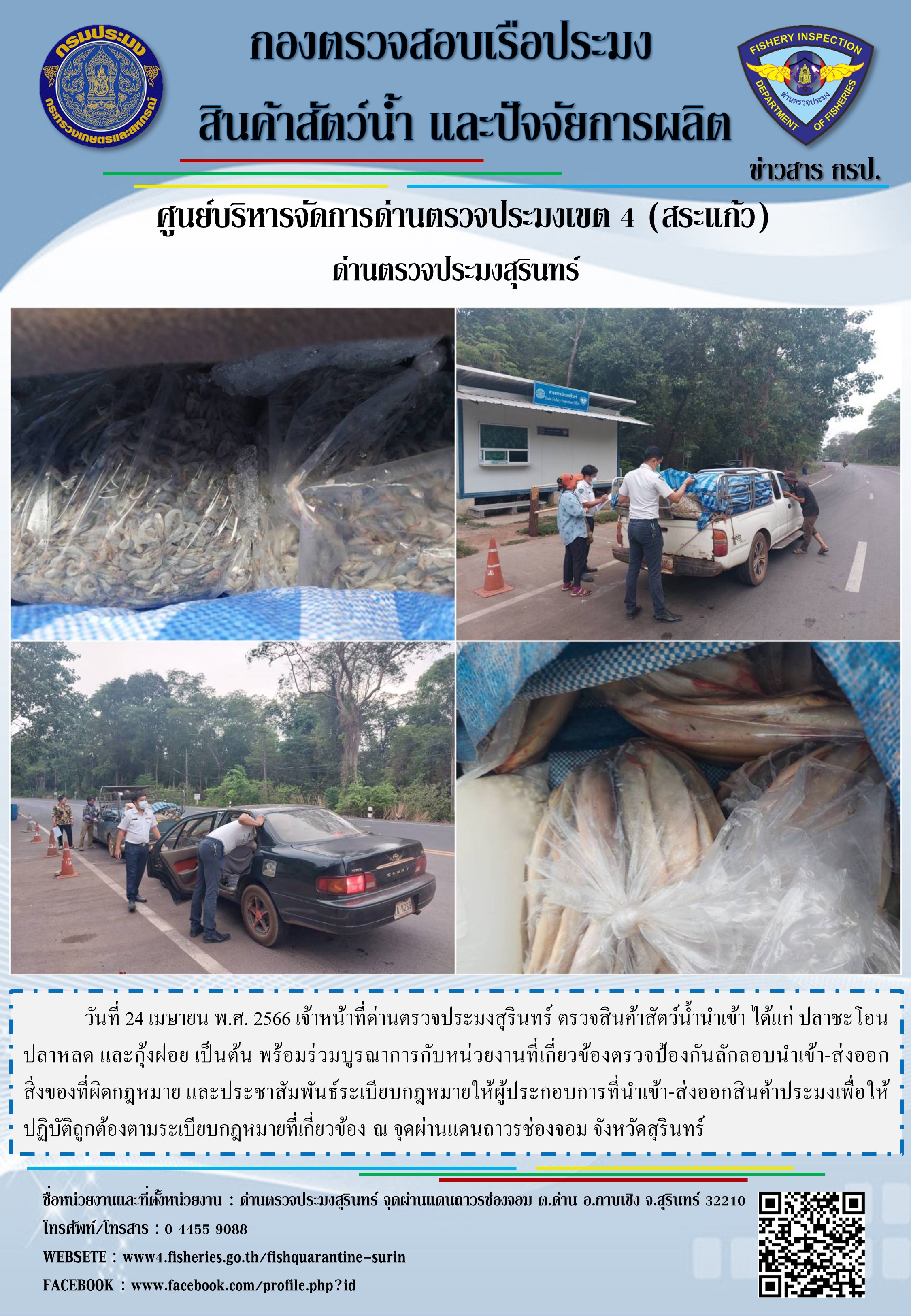 ผลการปฏิบัติงานด่านตรวจประมงสุรินทร์ วันที่ 24 เมษายน พ.ศ.2566 ณ จุดผ่านแดนถาวรช่องจอม..คลิก