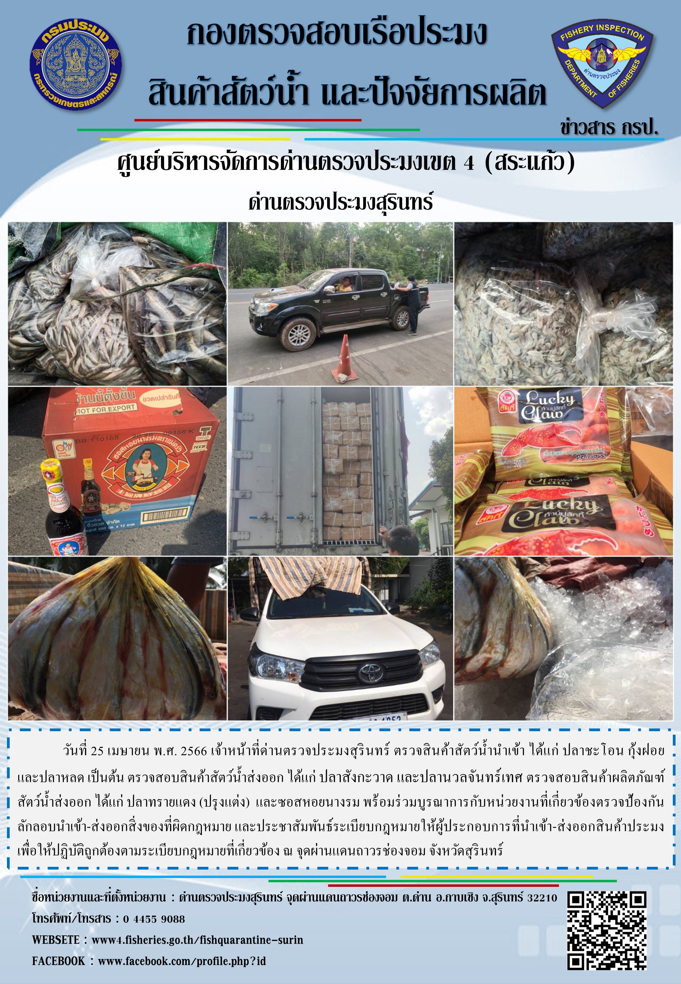 วันที่ 25 เมษายน พ.ศ. 2566 เจ้าหน้าที่ด่านตรวจประมงสุรินทร์ ตรวจสินค้าสัตว์น้ำนำเข้า ได้แก่ ปลาชะโอน กุ้งฝอย และปลาหลด เป็นต้น ตรวจสอบสินค้าสัตว์น้ำส่งออก ได้แก่ ปลาสังกะวาด และปลานวลจันทร์เทศ ตรวจสอบสินค้าผลิตภัณฑ์สัตว์น้ำส่งออก ได้แก่ ปลาทรายแดง (ปรุงแต่ง)  และซอสหอยนางรม พร้อมร่วมบูรณาการกับหน่วยงานที่เกี่ยวข้องตรวจป้องกันลักลอบนำเข้า-ส่งออกสิ่งของที่ผิดกฎหมาย และประชาสัมพันธ์ระเบียบกฎหมายให้ผู้ประกอบการที่นำเข้า-ส่งออกสินค้าประมงเพื่อให้ปฏิบัติถูกต้องตามระเบียบกฎหมายที่เกี่ยวข้อง ณ จุดผ่านแดนถาวรช่องจอม จังหวัดสุรินทร์