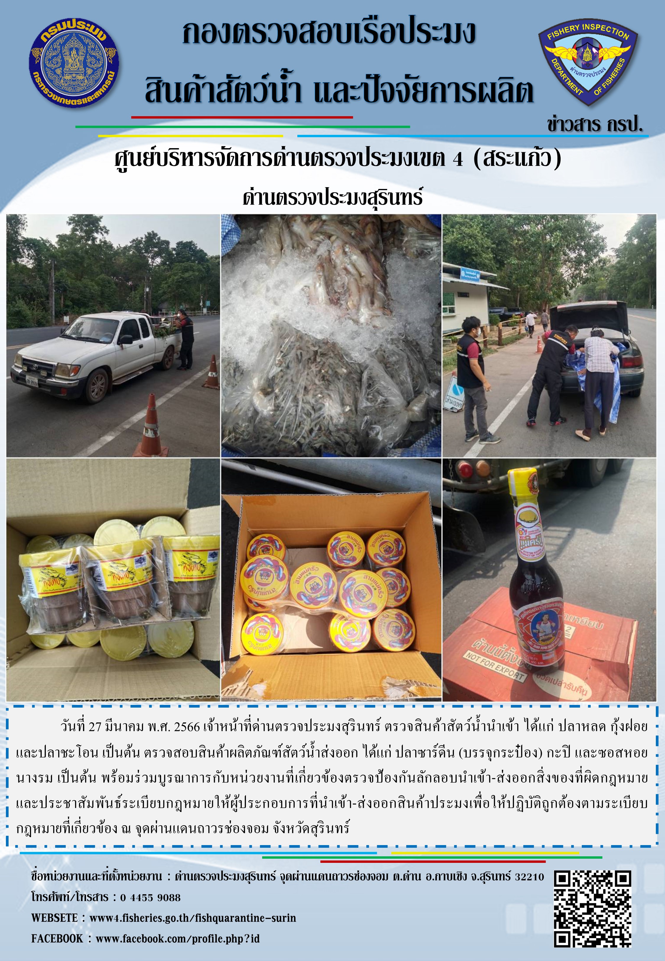 วันที่ 27 มีนาคม พ.ศ. 2566 เจ้าหน้าที่ด่านตรวจประมงสุรินทร์ ตรวจสินค้าสัตว์น้ำนำเข้า ได้แก่ ปลาหลด กุ้งฝอย และปลาชะโอน เป็นต้น ตรวจสอบสินค้าผลิตภัณฑ์สัตว์น้ำส่งออก ได้แก่ ปลาซาร์ดีน (บรรจุกระป๋อง) กะปิ และซอสหอยนางรม เป็นต้น พร้อมร่วมบูรณาการกับหน่วยงานที่เกี่ยวข้องตรวจป้องกันลักลอบนำเข้า-ส่งออกสิ่งของที่ผิดกฎหมาย และประชาสัมพันธ์ระเบียบกฎหมายให้ผู้ประกอบการที่นำเข้า-ส่งออกสินค้าประมงเพื่อให้ปฏิบัติถูกต้องตามระเบียบกฎหมายที่เกี่ยวข้อง ณ จุดผ่านแดนถาวรช่องจอม จังหวัดสุรินทร์