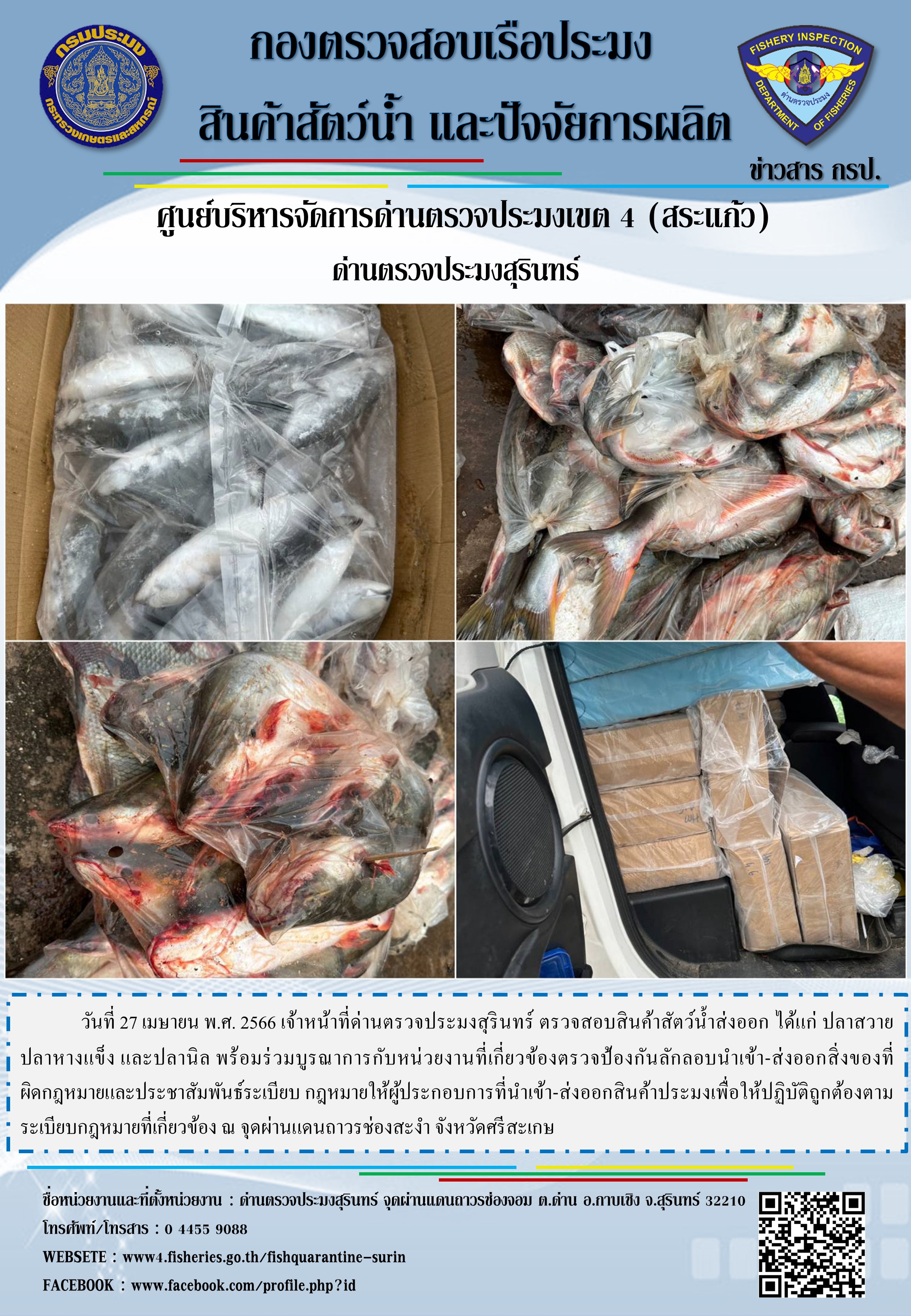 วันที่ 27 เมษายน พ.ศ. 2566 เจ้าหน้าที่ด่านตรวจประมงสุรินทร์ ตรวจสอบสินค้าสัตว์น้ำส่งออก ได้แก่ ปลาสวาย ปลาหางแข็ง และปลานิล พร้อมร่วมบูรณาการกับหน่วยงานที่เกี่ยวข้องตรวจป้องกันลักลอบนำเข้า-ส่งออกสิ่งของที่ผิดกฎหมายและประชาสัมพันธ์ระเบียบ กฎหมายให้ผู้ประกอบการที่นำเข้า-ส่งออกสินค้าประมงเพื่อให้ปฏิบัติถูกต้องตามระเบียบกฎหมายที่เกี่ยวข้อง ณ จุดผ่านแดนถาวรช่องสะงำ จังหวัดศรีสะเกษ